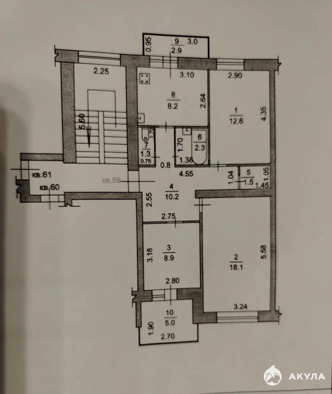 Продается 3-х комн. квартира общей площадью 63 кв.м. на 2 этаже 5-ти этажного кирпичного дома в центе г. Абинска.