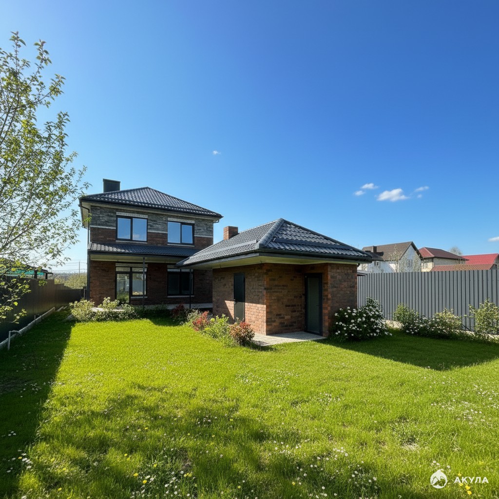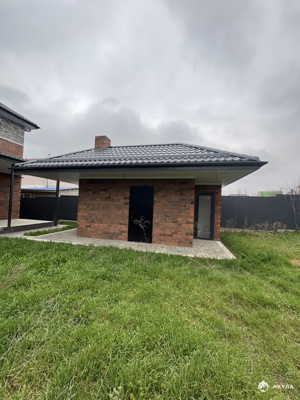 За домом ровный участок с террасой и зоной отдыха.Большой кирпичный мангал с кухней , сан узлом и помещение свободной планировки.