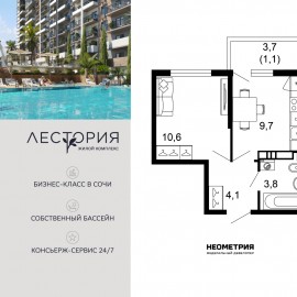 Продается квартира в жилом комплексе бизнес-класса «Лестория». В составе ЖК предусмотрена собственная аквазона площадью 473 квадратных метра с двумя подогреваемыми бассейнами, что соответствуют стандартам бизнес-класса. Аквазона объединяет взрослый и детский бассейны....