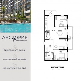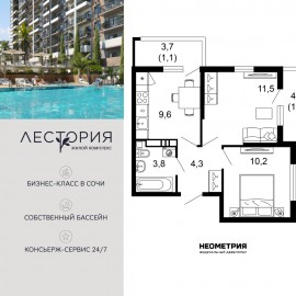 Продается квартира в жилом комплексе бизнес-класса «Лестория». В составе ЖК предусмотрена собственная аквазона площадью 473 квадратных метра с двумя подогреваемыми бассейнами, что соответствуют стандартам бизнес-класса. Аквазона объединяет взрослый и детский бассейны....
