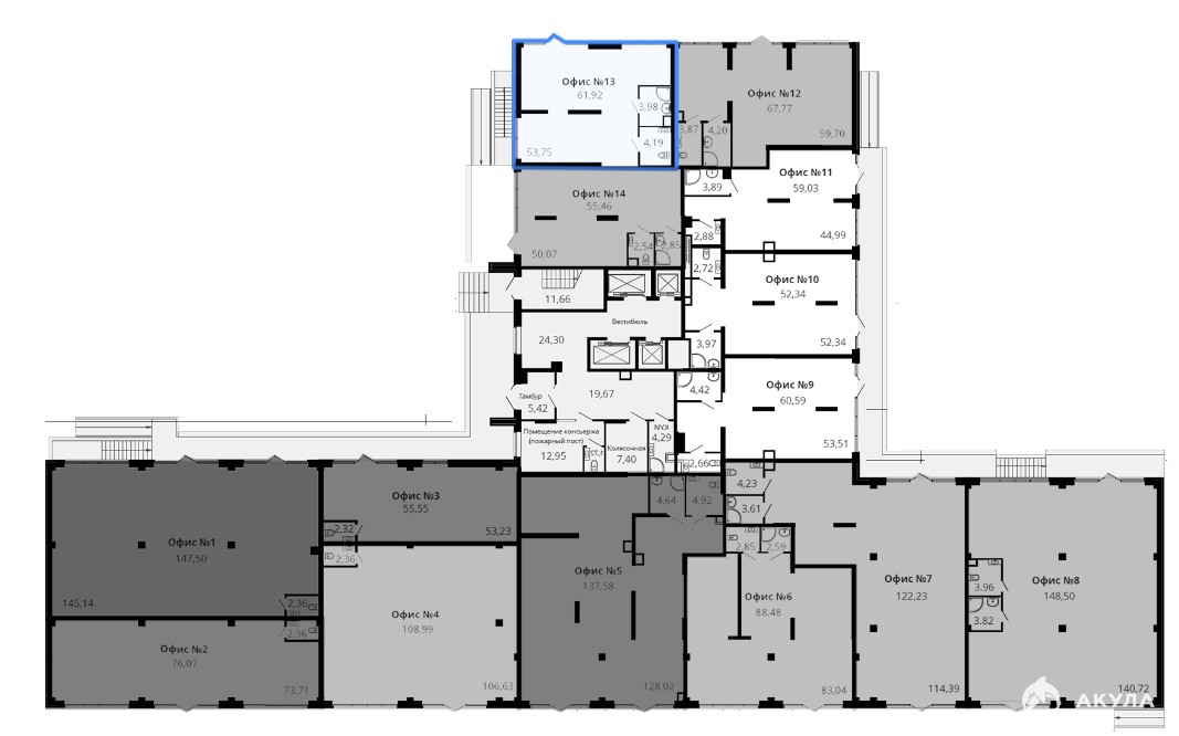 Помещение с панорамными окнами, правильной формы, с центральными коммуникациями.