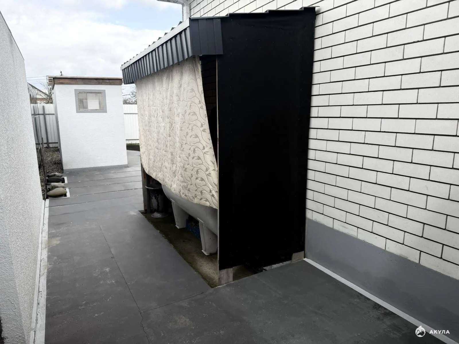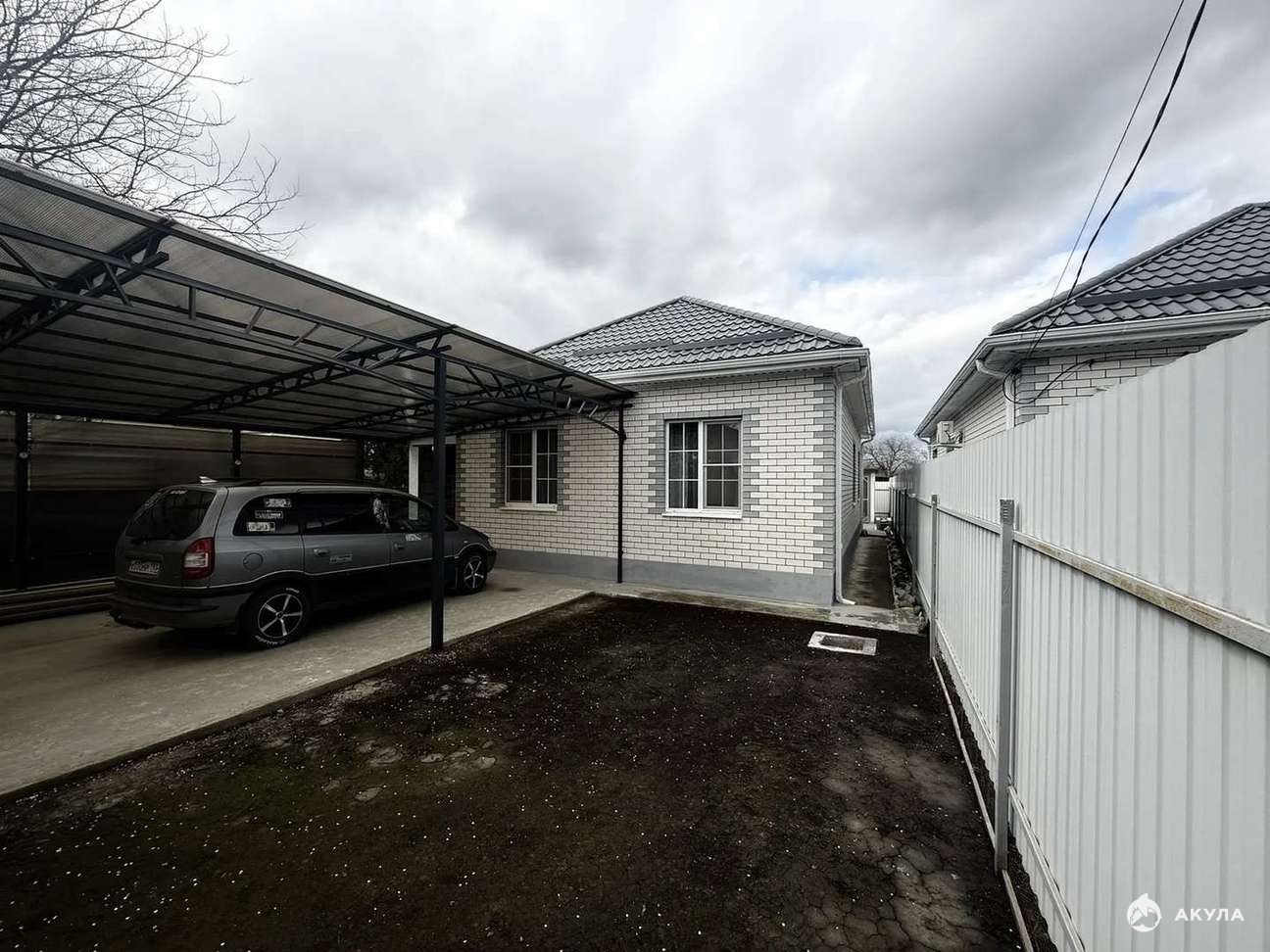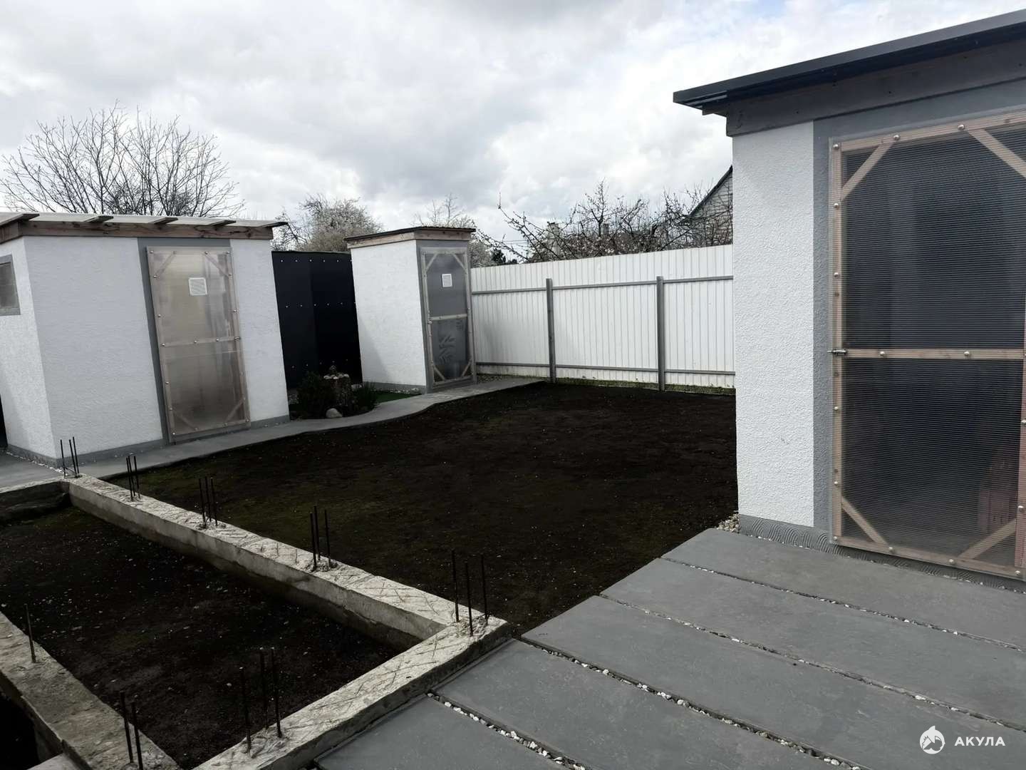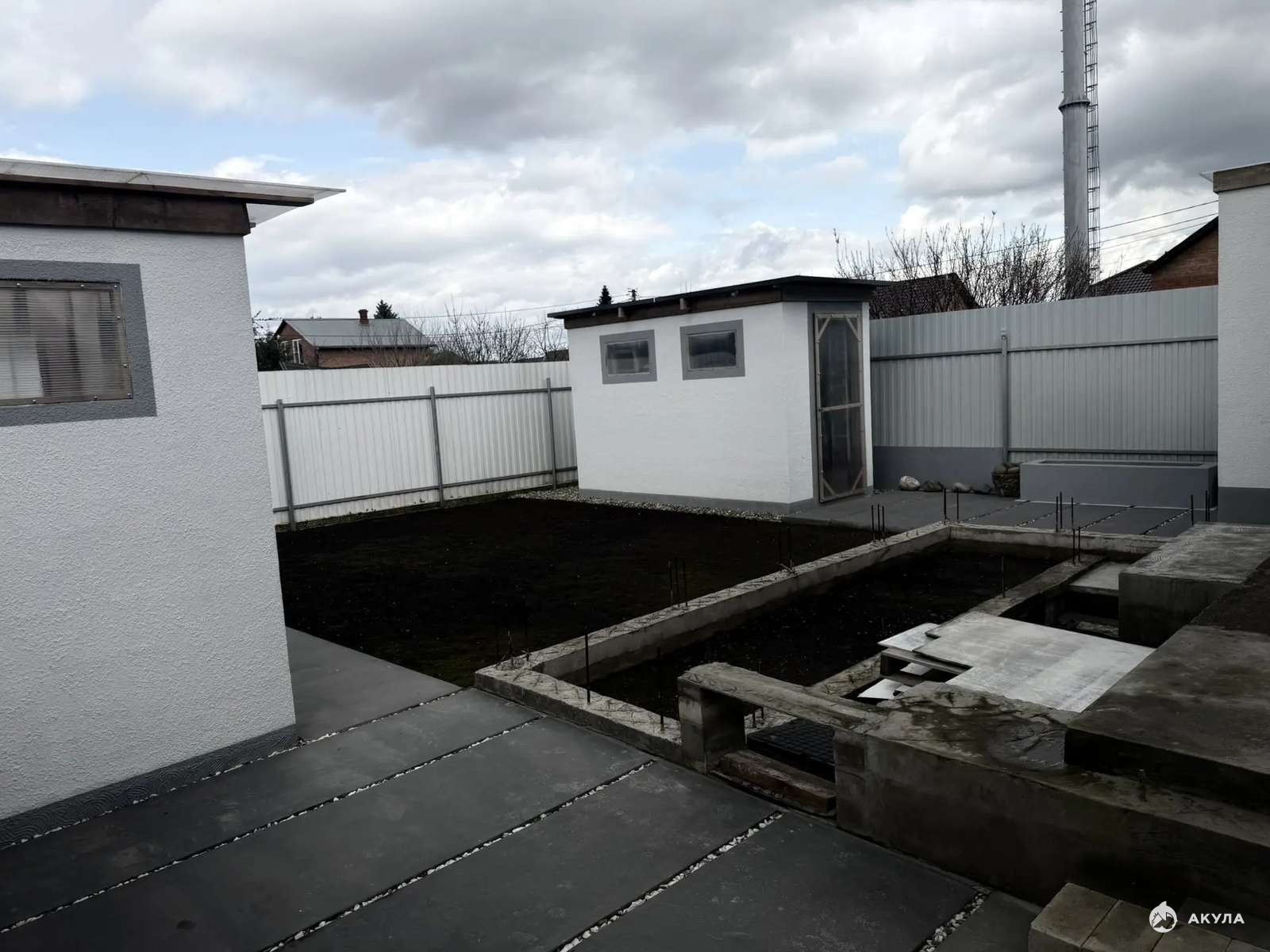 Во дворе монолитная бетонная площадка на которой разместится 2 автомобиля. Ровный участок.