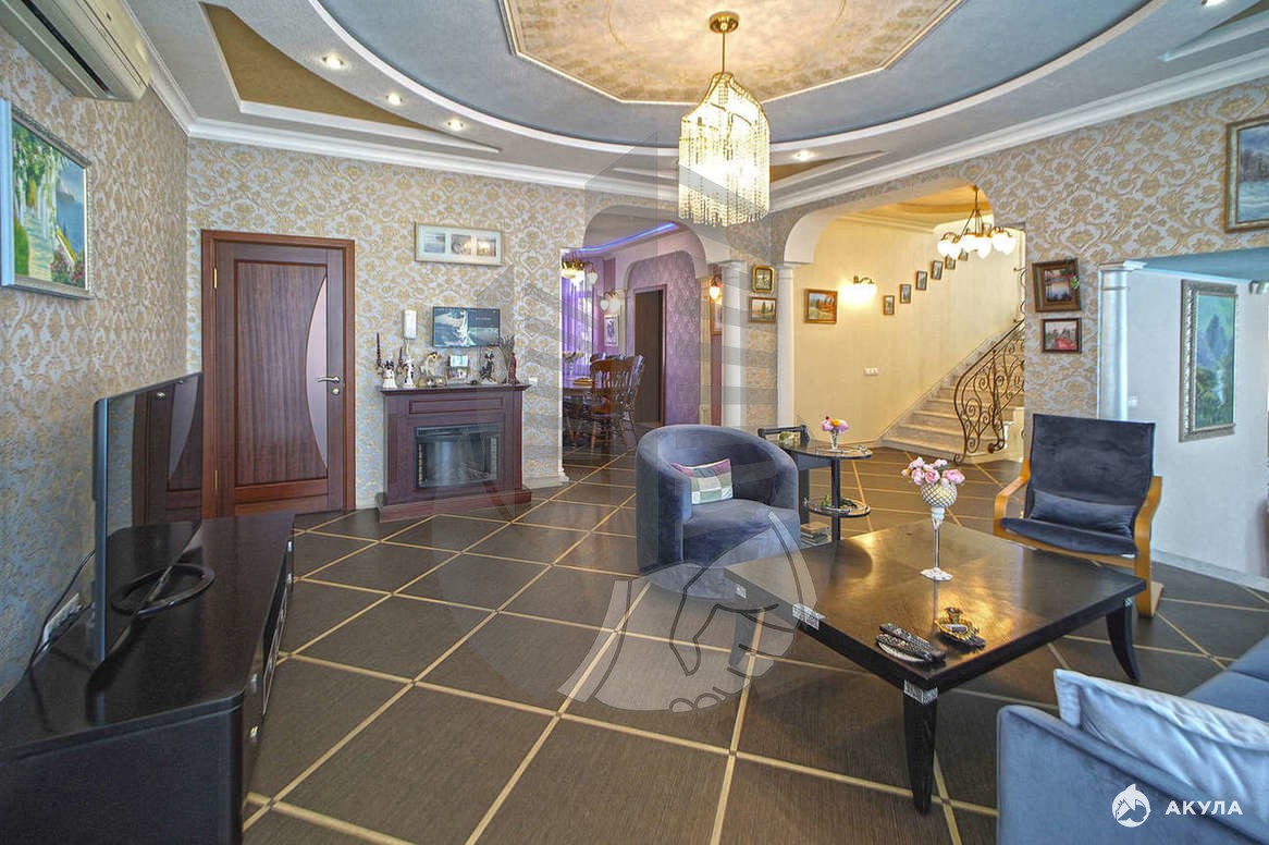 Ремонт выполнен в классическом стиле. Дом очень ухоженный уютный светлый. Удачно подобранные по цвету и фактуре обои, множество люстр, светильников, бра. Потолки из гипсокартона многоуровневые с подсветкой. Шикарная монолитная бетонная лестница с узорчатыми коваными перилами.