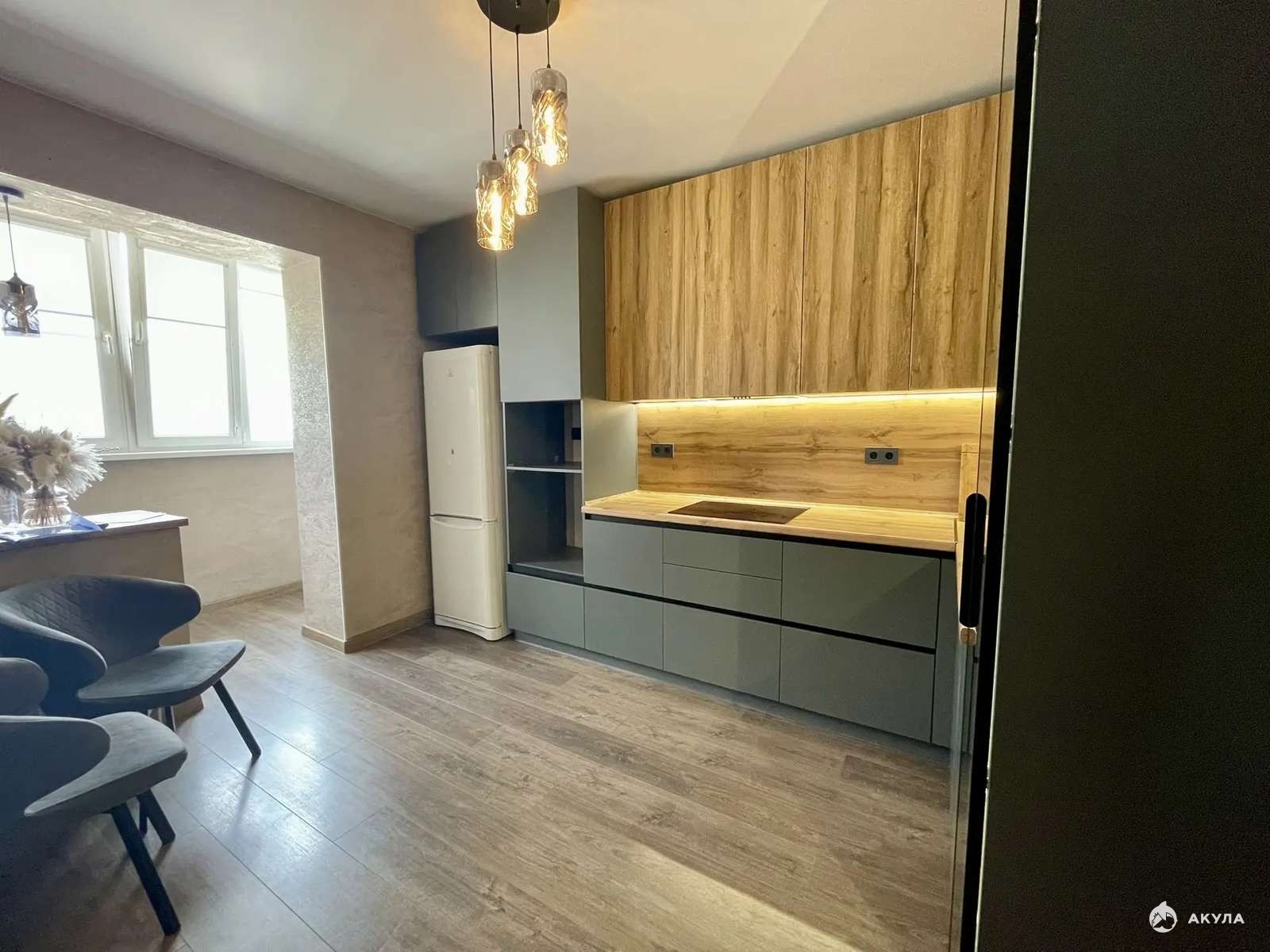 На кухне установлен новый встроенный кухонный гарнитур со всей техникой (посудомоечная машина, плита, холодильник), а также кухонный стул со стульями.