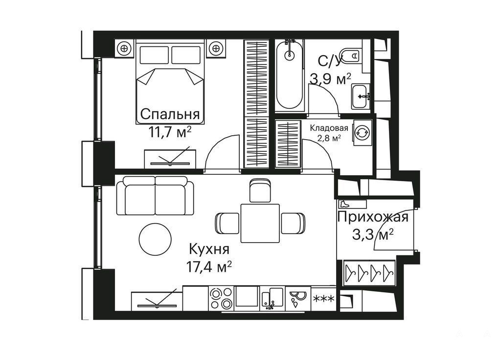 Общая площадь 39м2, кухня 17м2