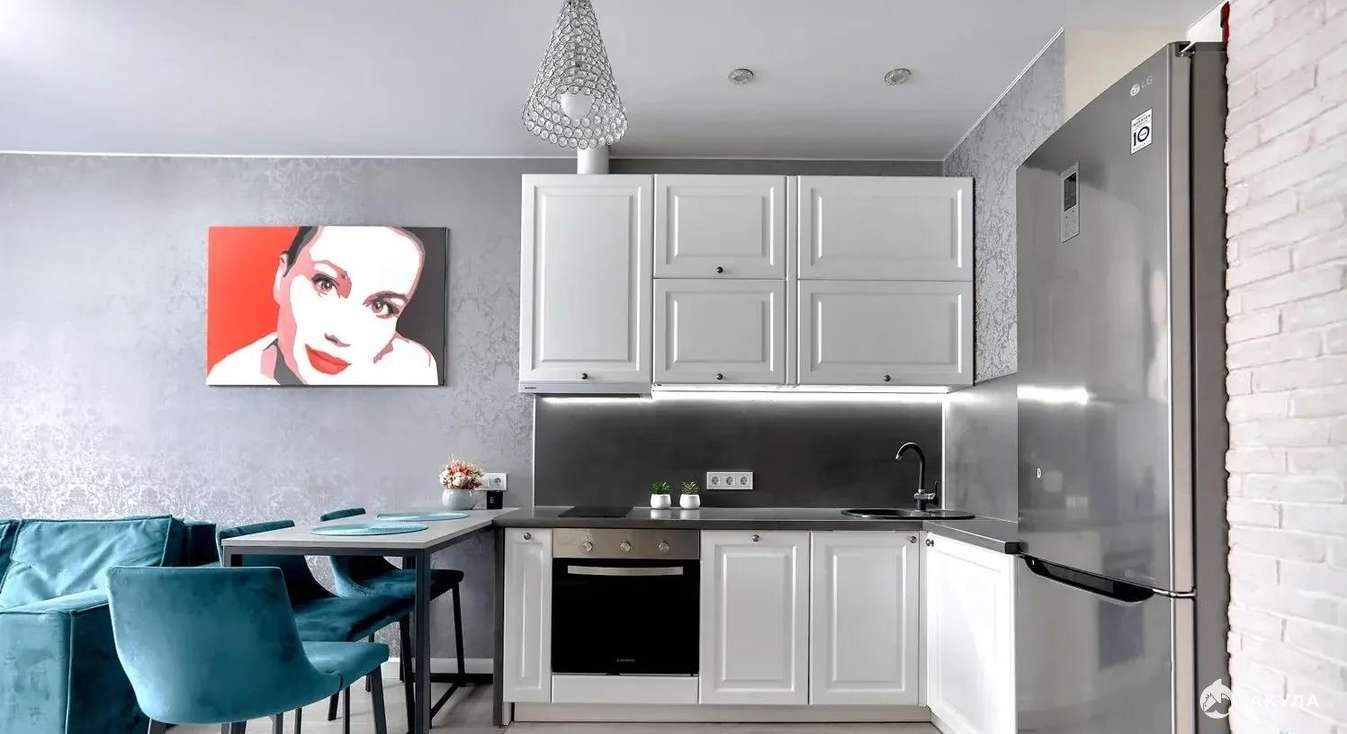 Просторная кухня-гостинная место для отдыха и гостей.