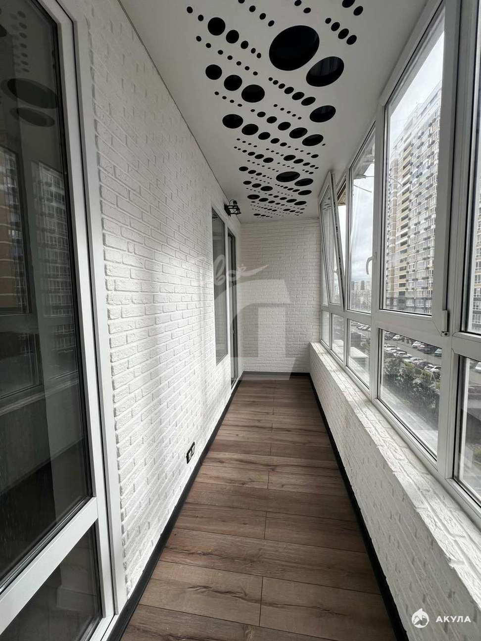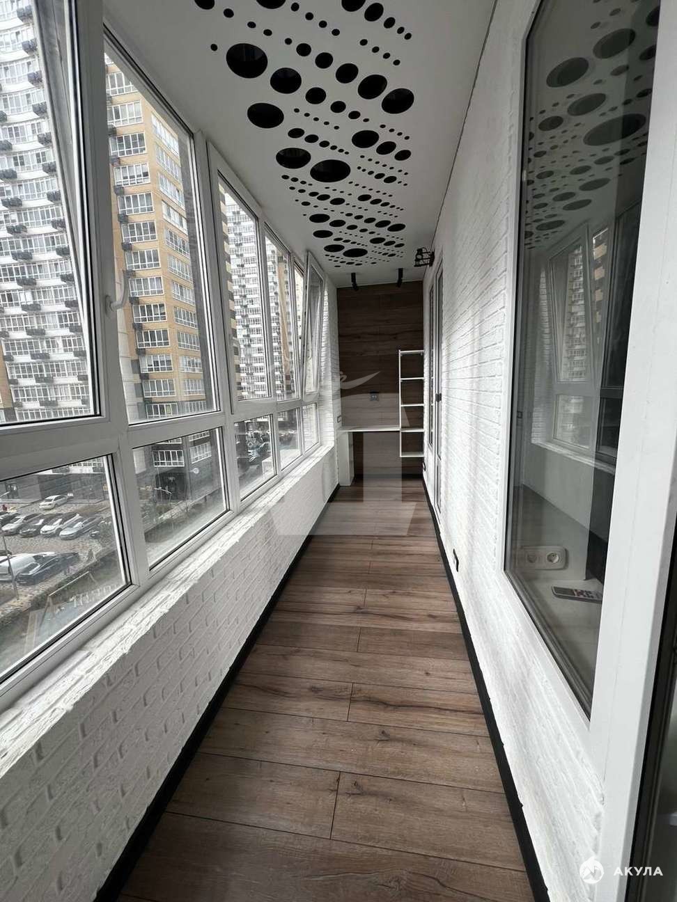 На кухне располагается кулинарная зона с барной стойкой, диван для отдыха и ТВ-зона. Жилая комната просторная 16 м2 имеет выход на остекленную ленточную лоджию. На лоджии оборудовано рабочее место. Есть гардеробная для хранения вещей.