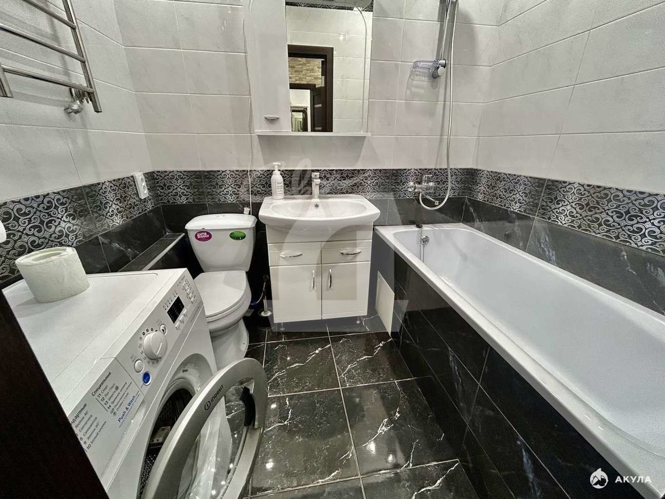 Совмещенный санузел - 4 кв м в отличном состоянии с ванной и стиральной машинкой.
