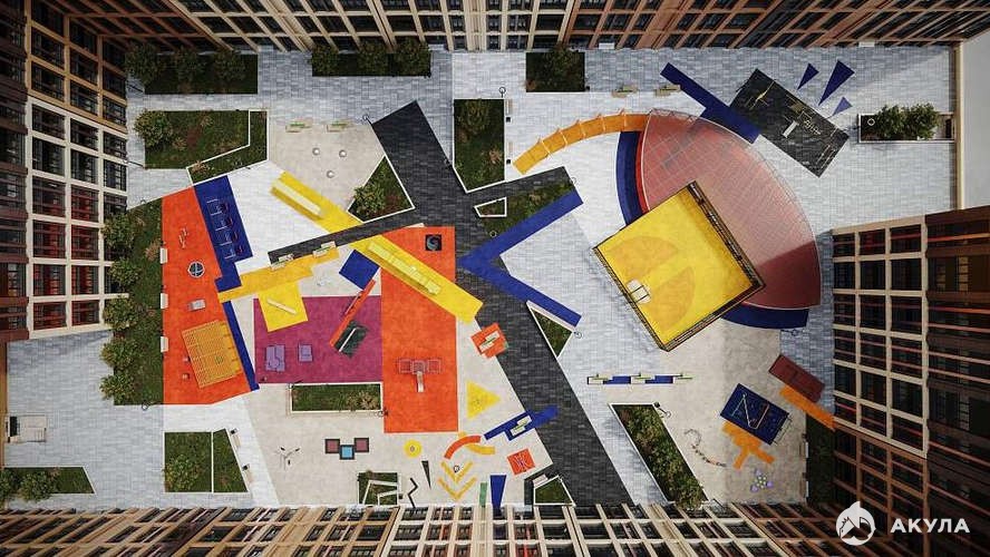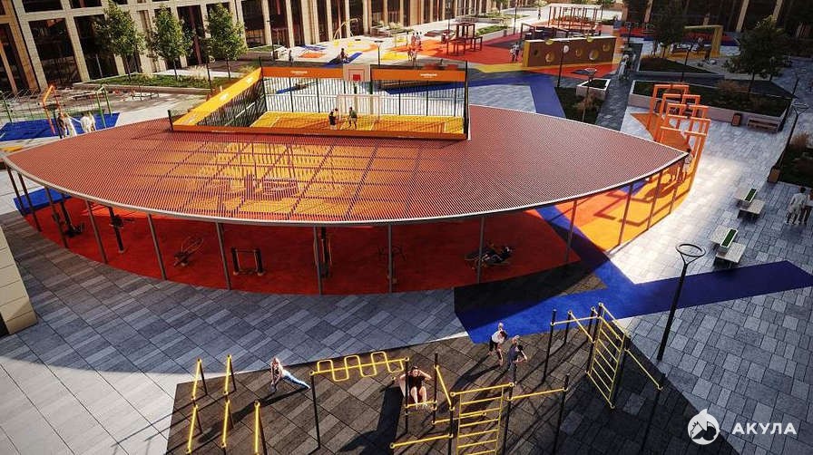 Дворы закрыты от машин и наполнены зонами отдыха с современными малыми архитектурными формами, перголами, качелями, спортивными и детскими площадками.