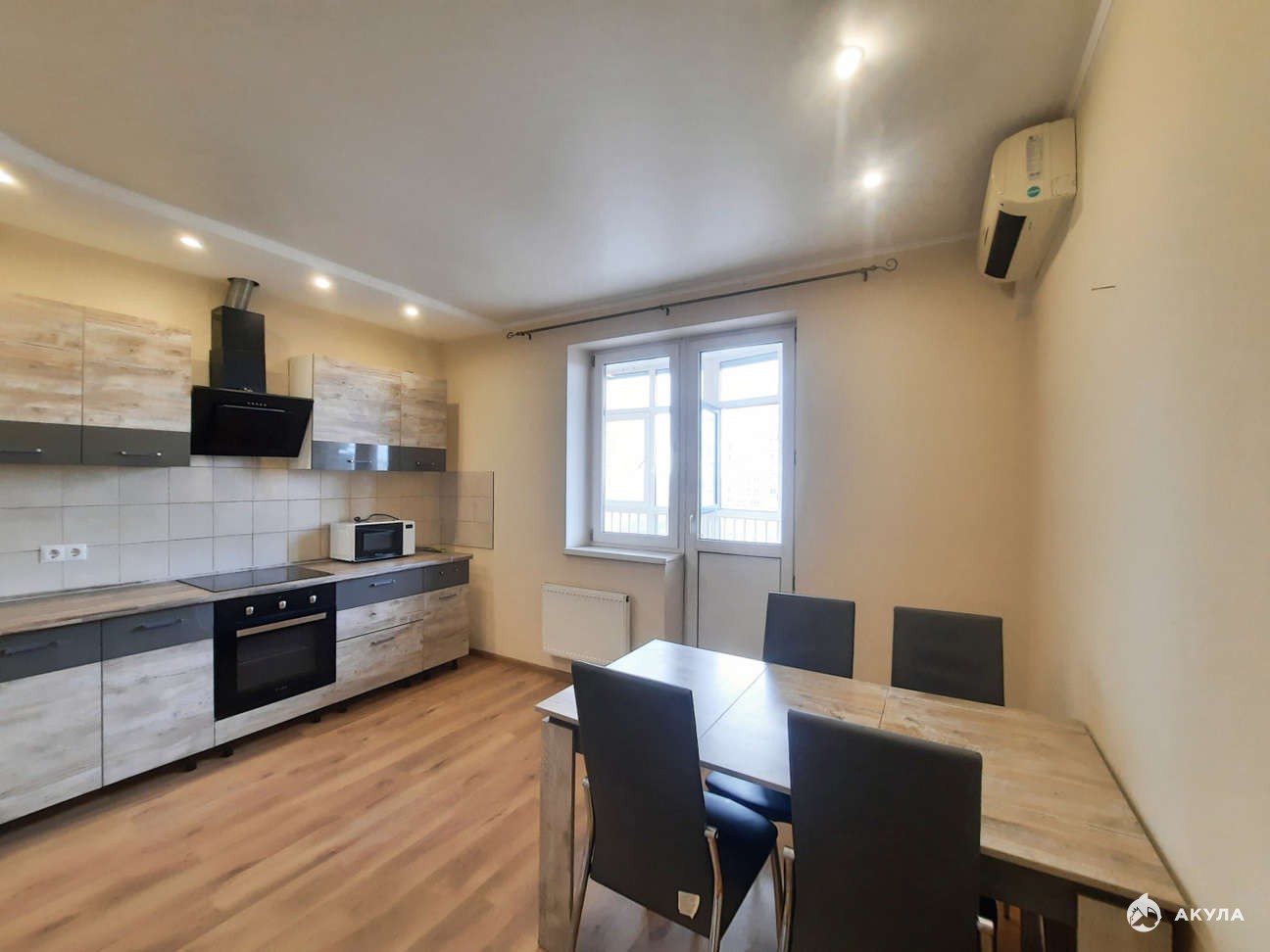 Кухня с выходом на лоджию с витражным остеклением.