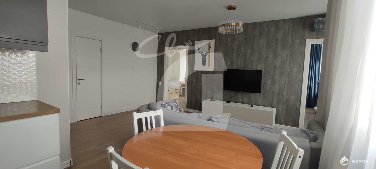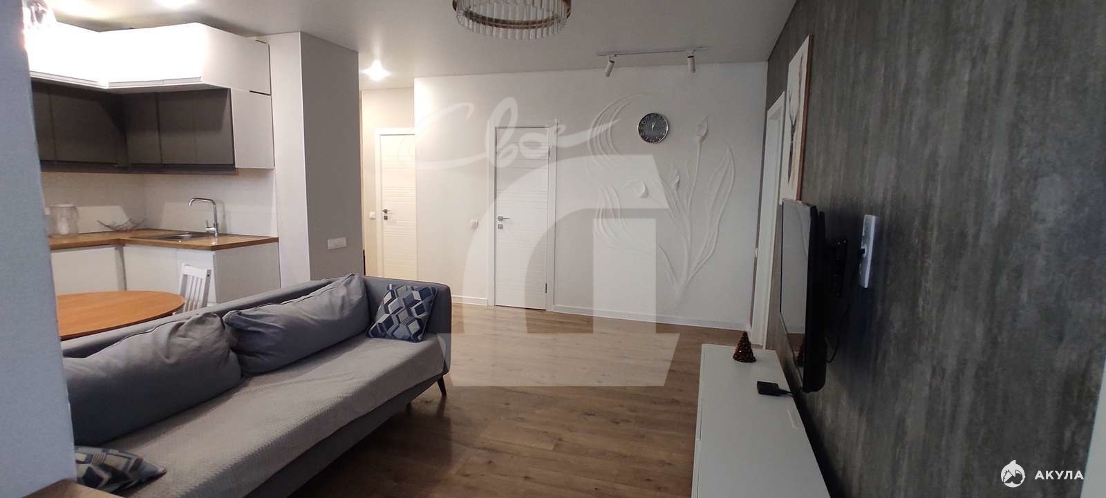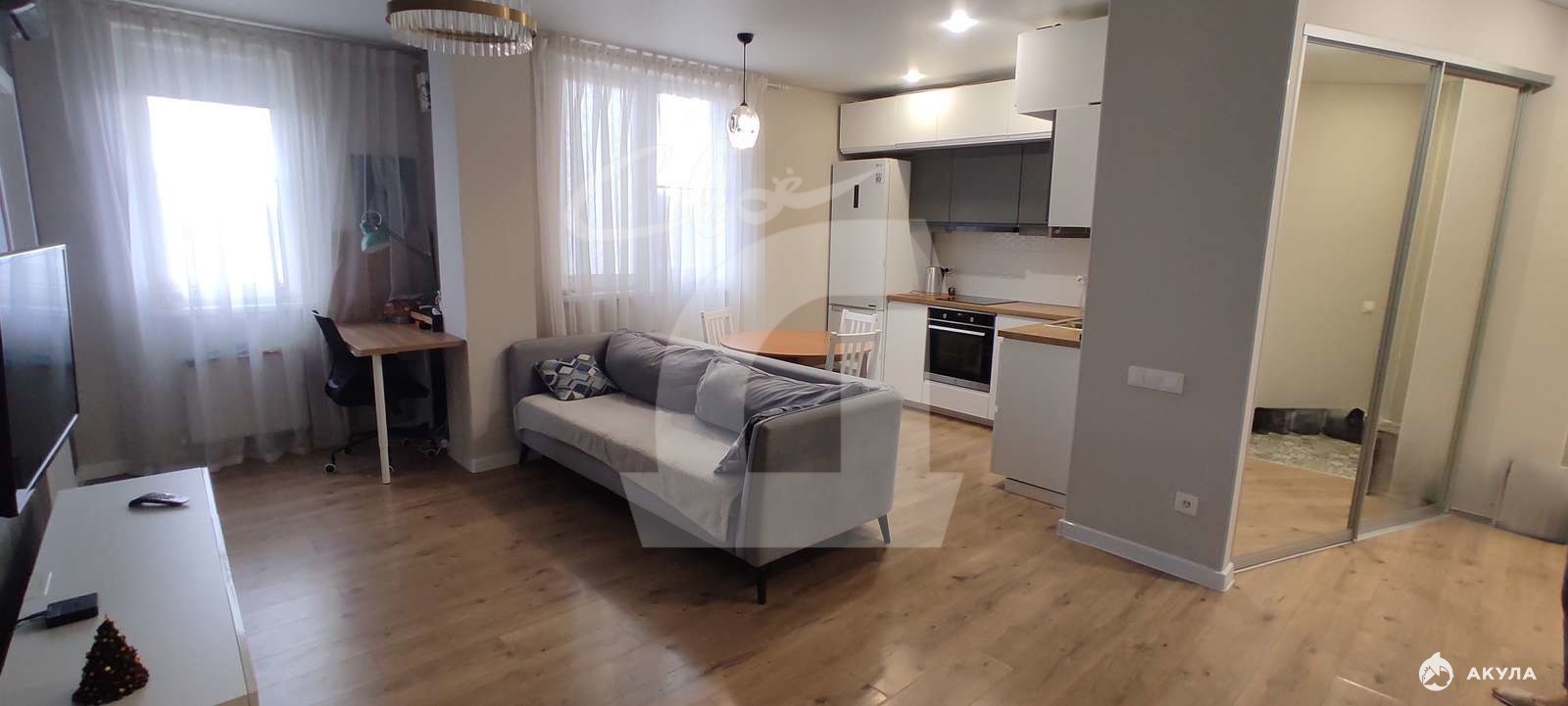 Удобная открытая планировка распашонка с полноценными двумя спальнями и большой гостиной-кухней.