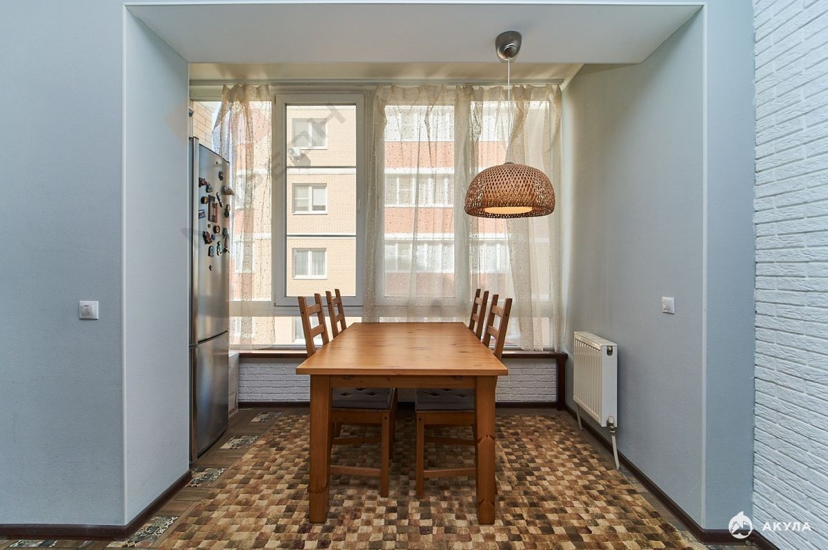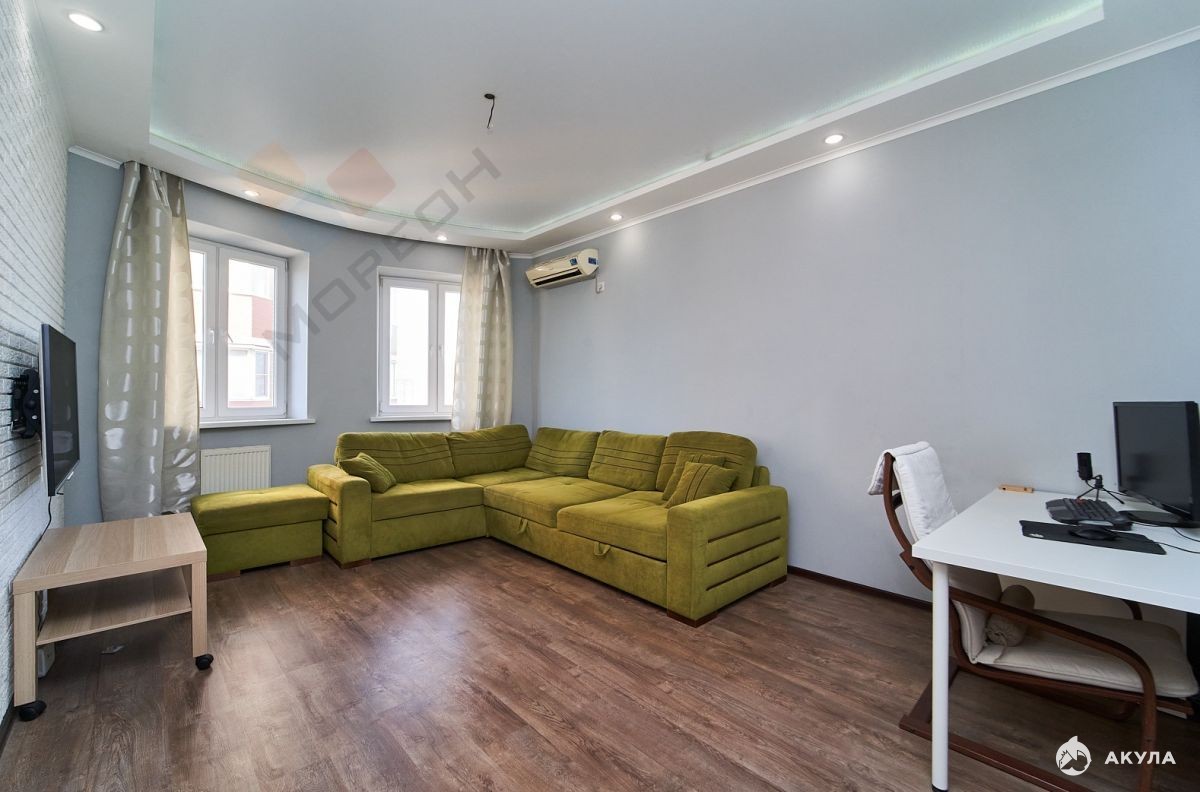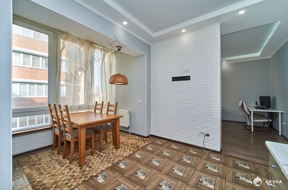 Выполнен качественный ремонт, на полу ламинат повышенной прочности, матовый подвесной потолок с точечными светильниками и подсветкой, кафель на полу в кухне.