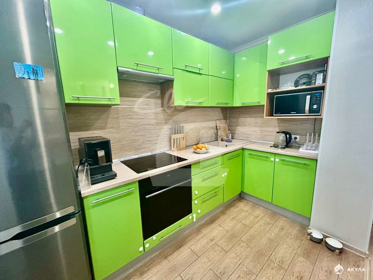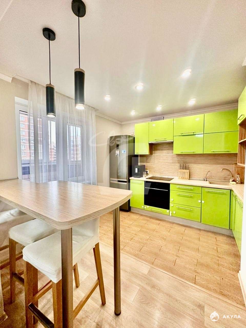 В кухне установлен стильная кухонная стенка со встроенной техникой , барная стойка-стол со стульями , сплит-система, холодильник.