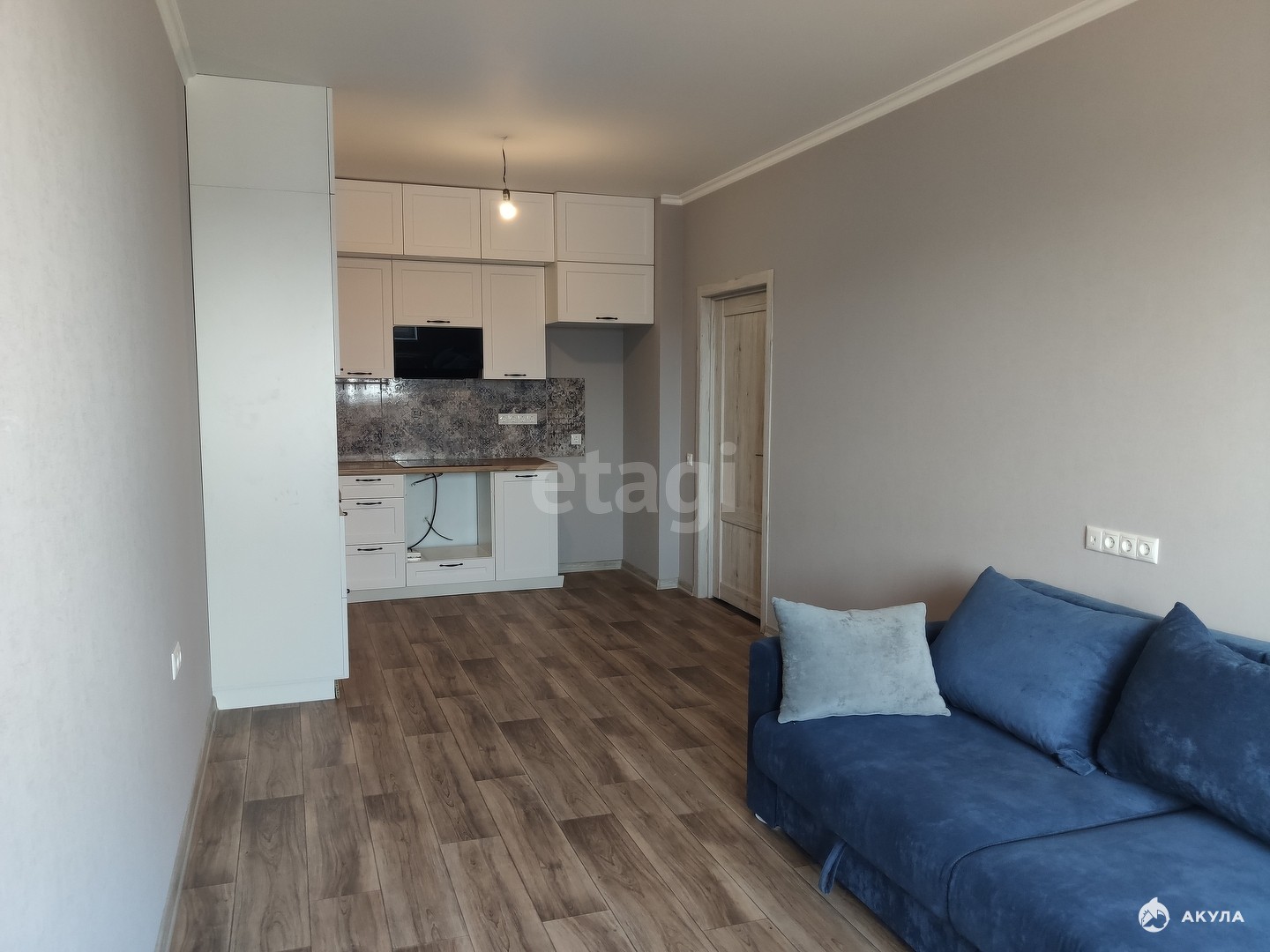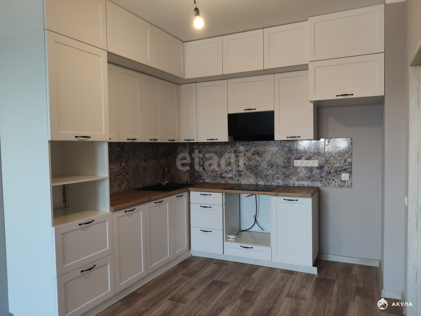 Останется кухонный гарнитур (до подорожания стоил 300т.р.), из техники остаётся вытяжка, фартук сделан из плитки.