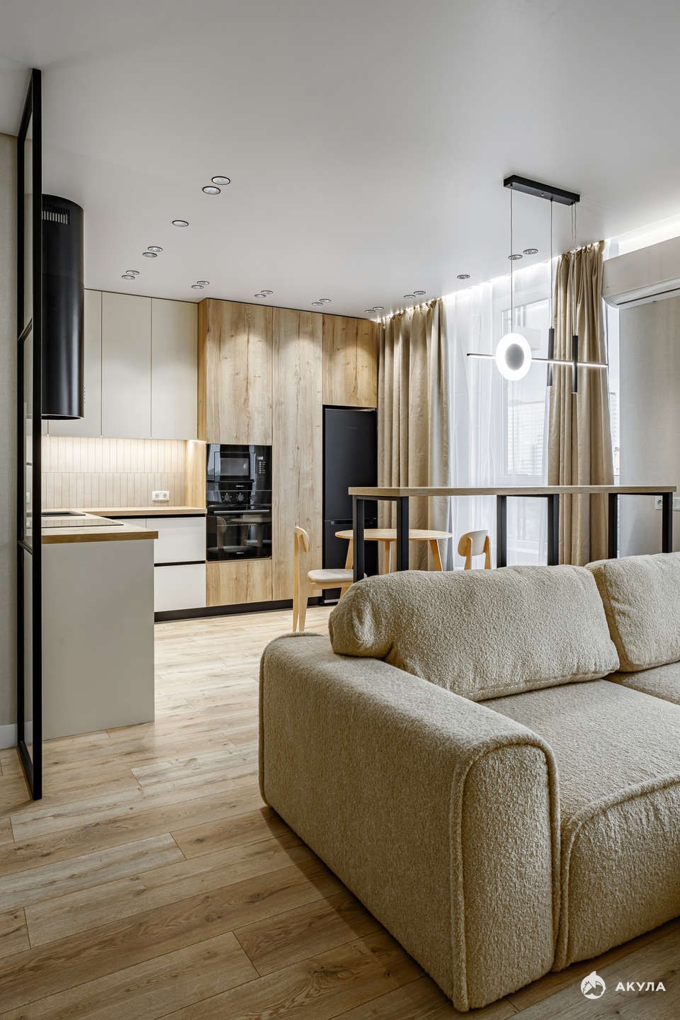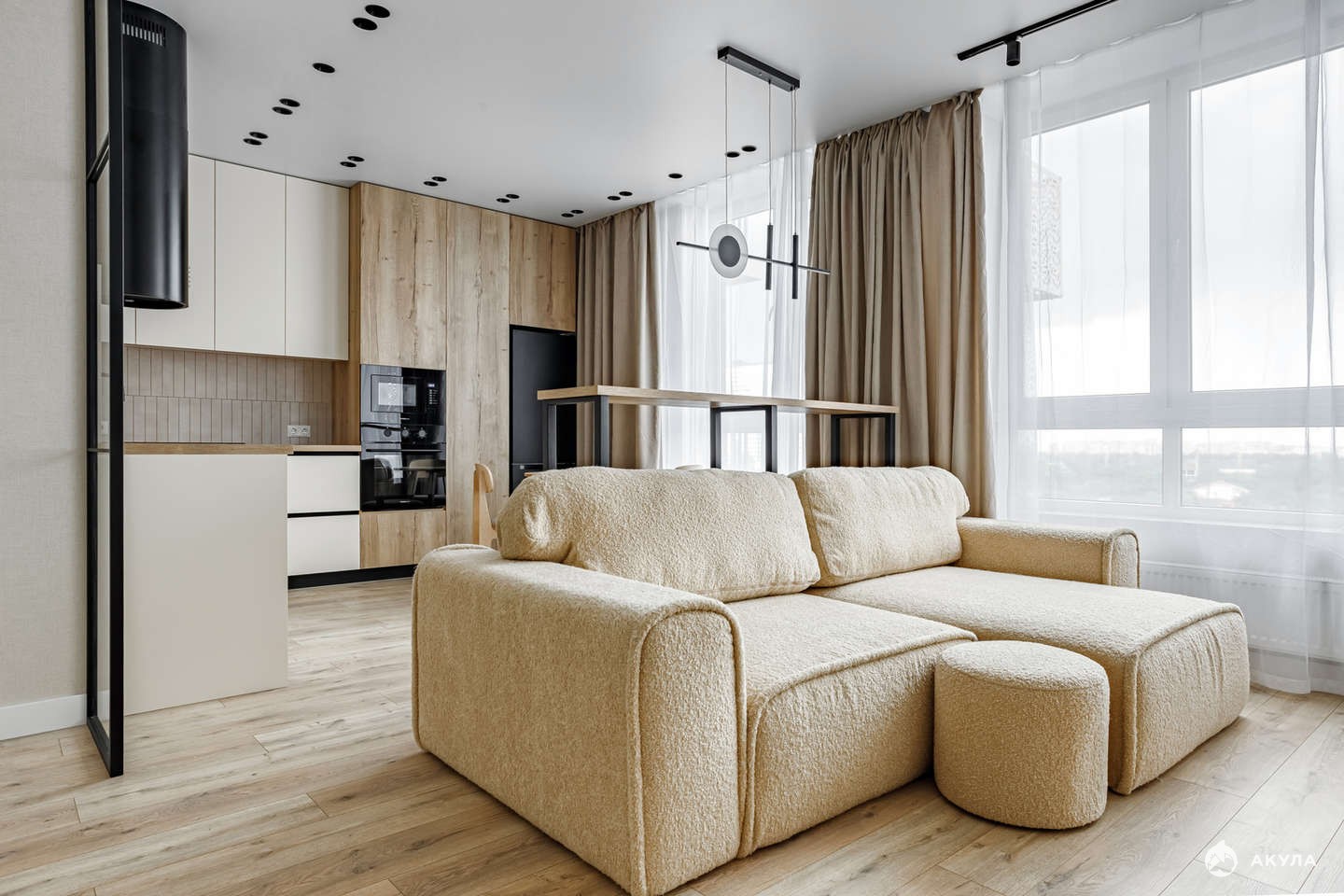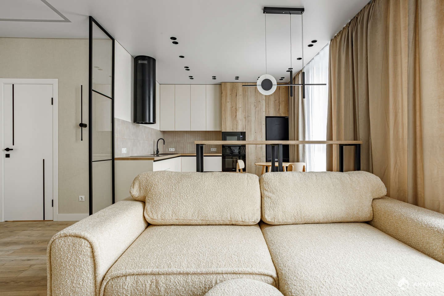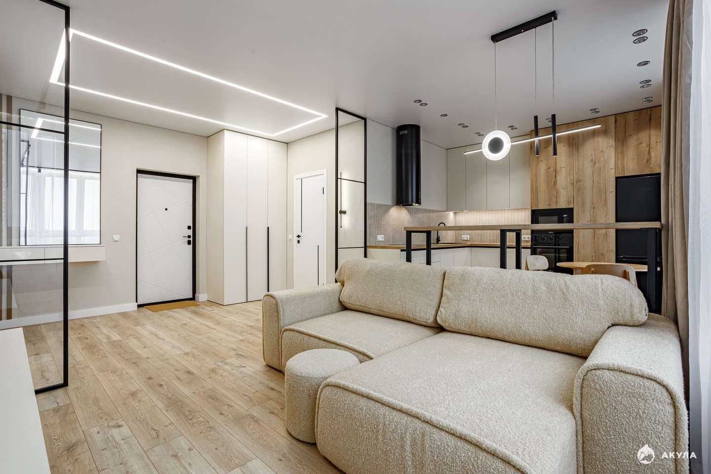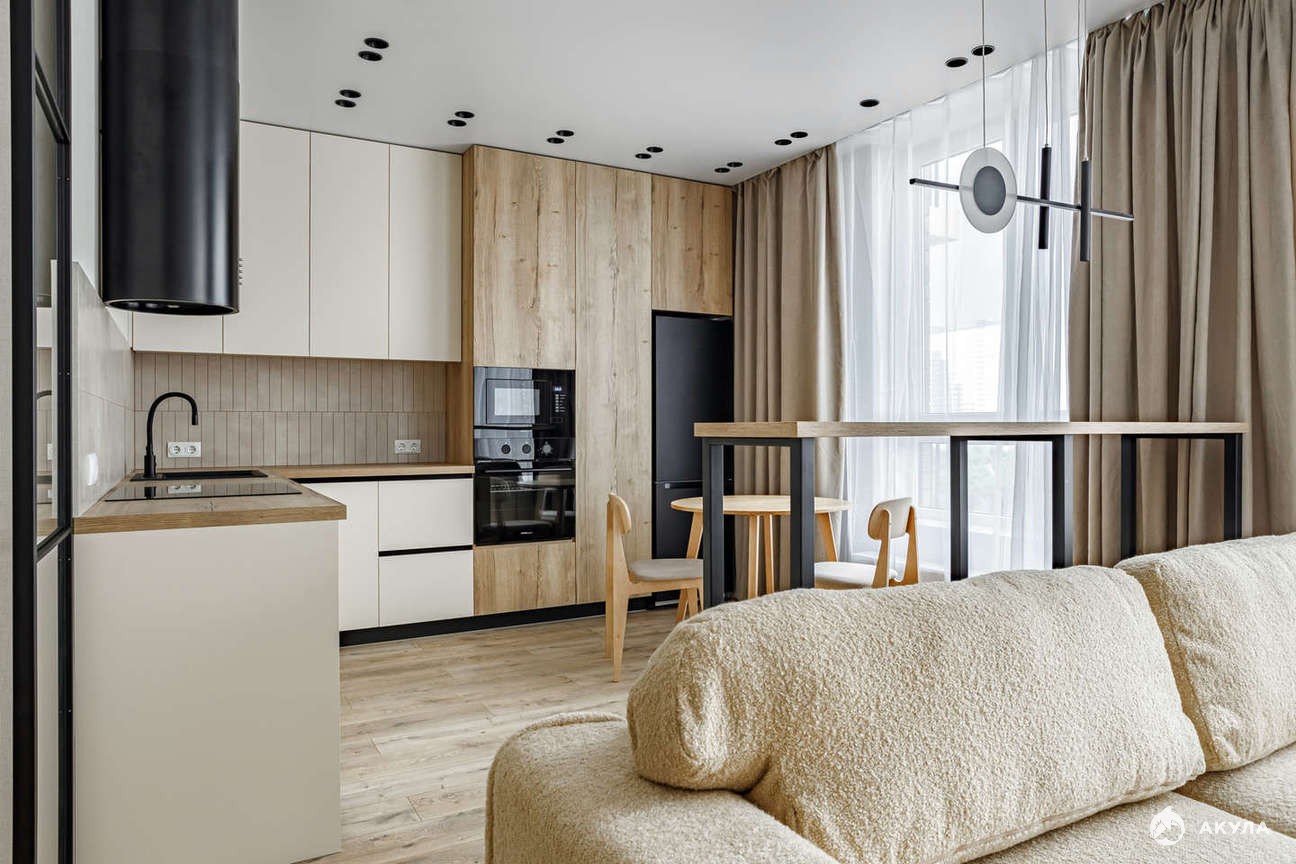1 изолированная комната и просторная кухня-гостинная. Общая площадь 54 кв.м., жилая - 40 кв.м., кухня - 10 кв.м.