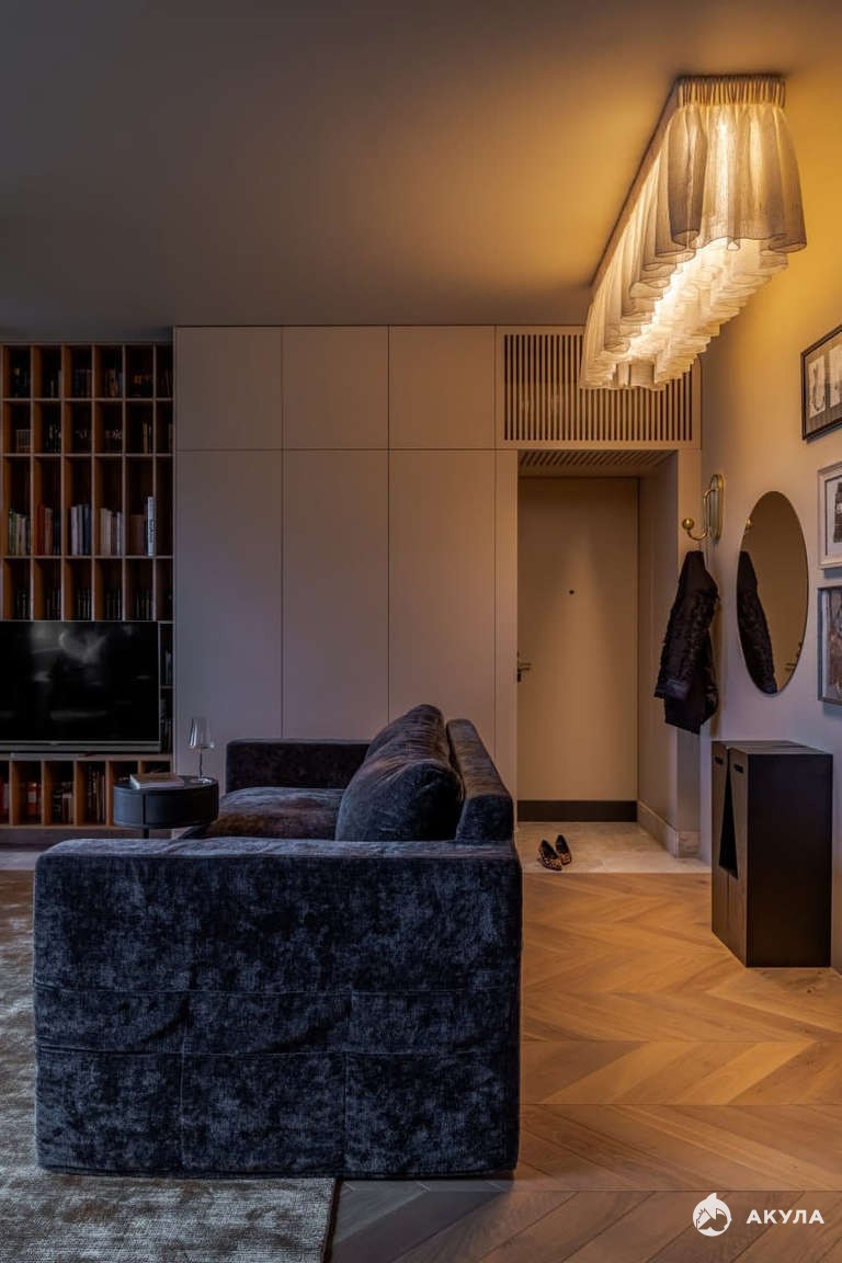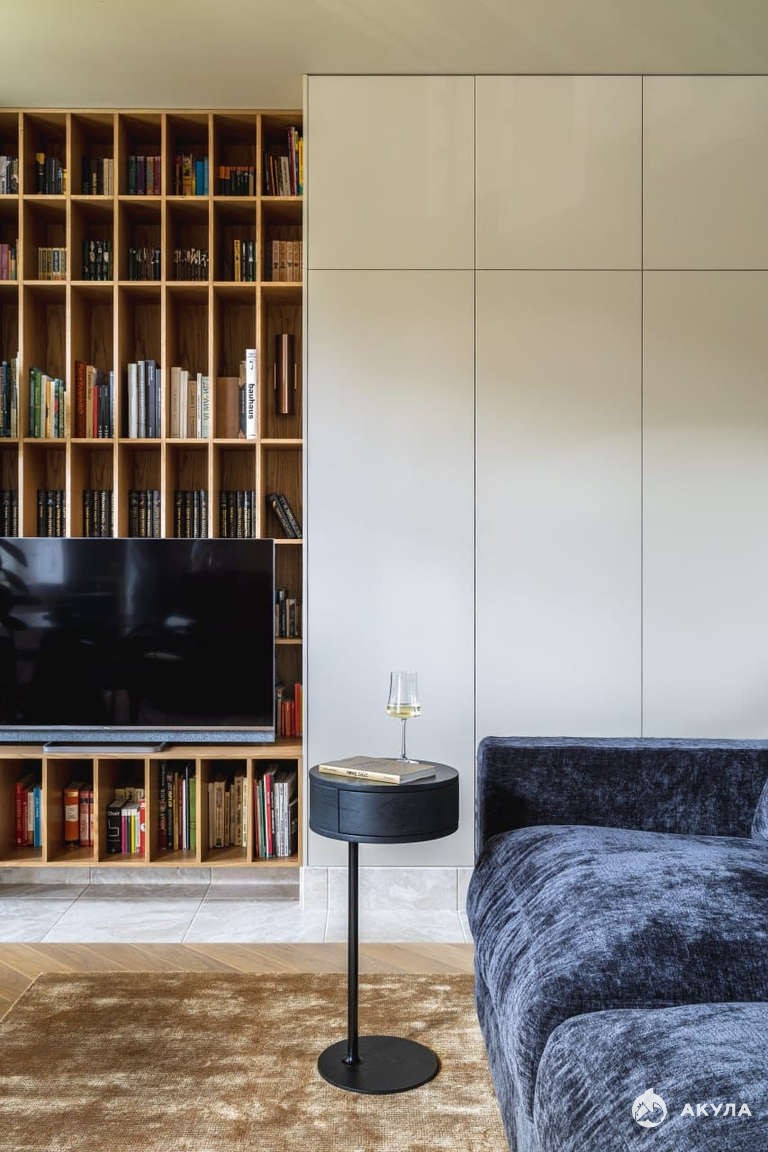 Хранение в гостиной-большой шкаф с фасадами под цвет стен, выполнен из МДФ + эмаль, фурнитура Blum.