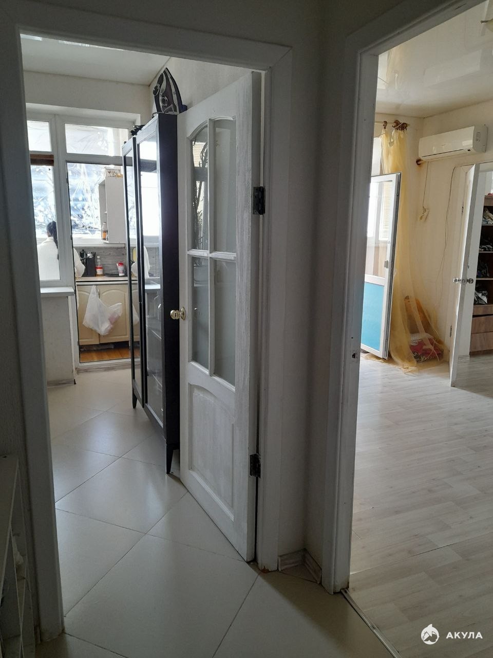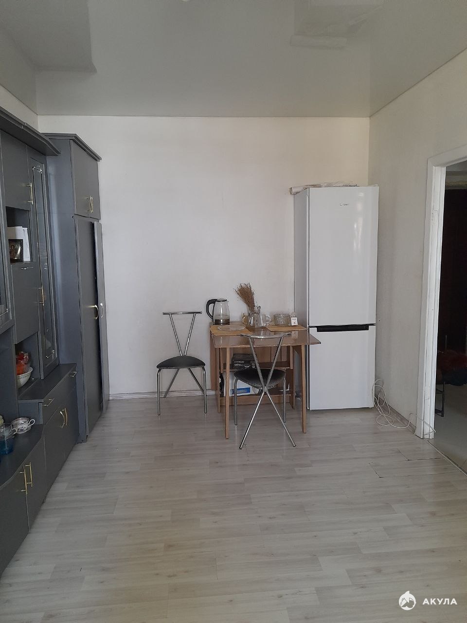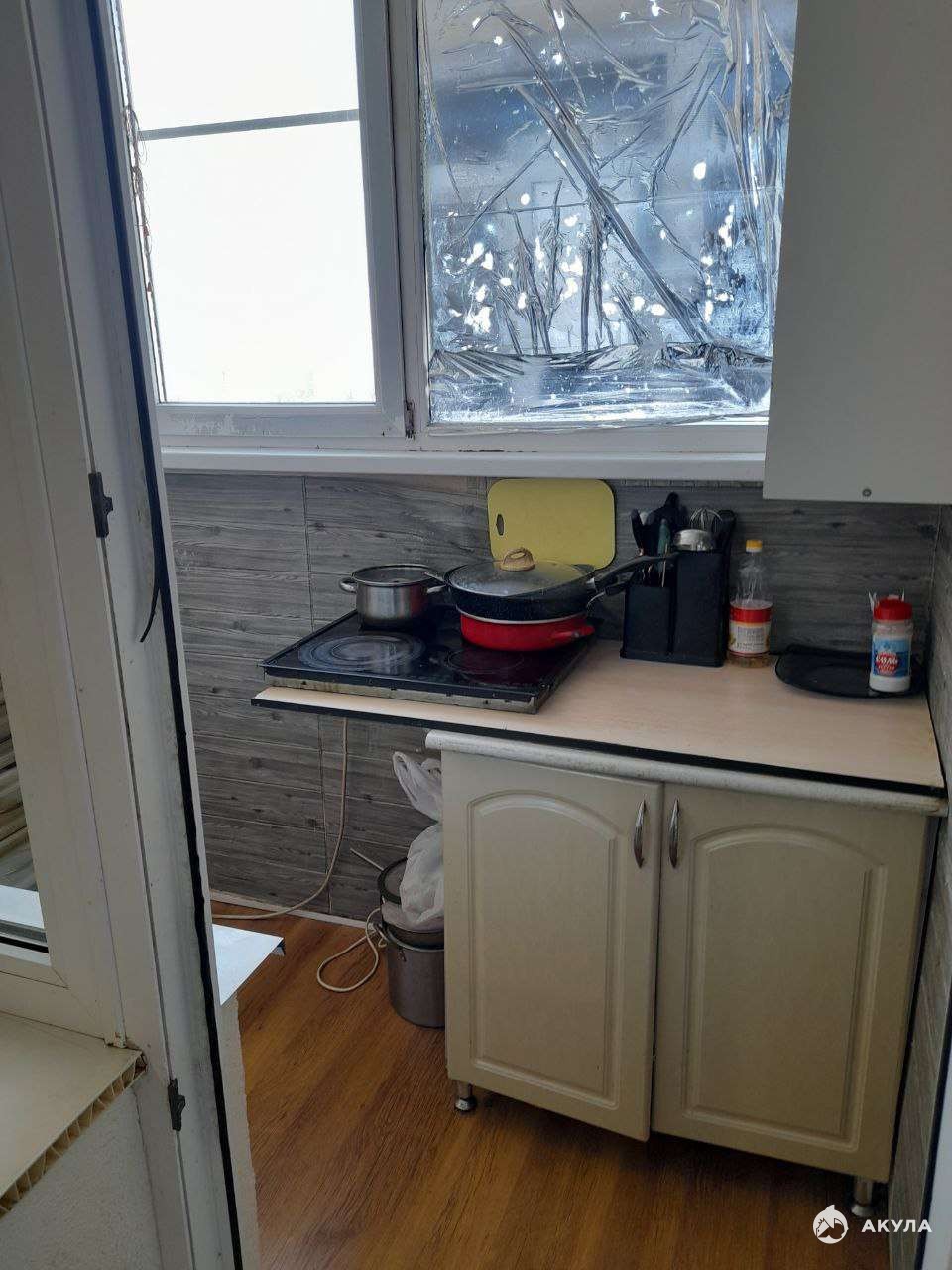 В квартире натяжные потолки, ламинат, стены окрашены, нуждаются в обновлении, но жить можно.
