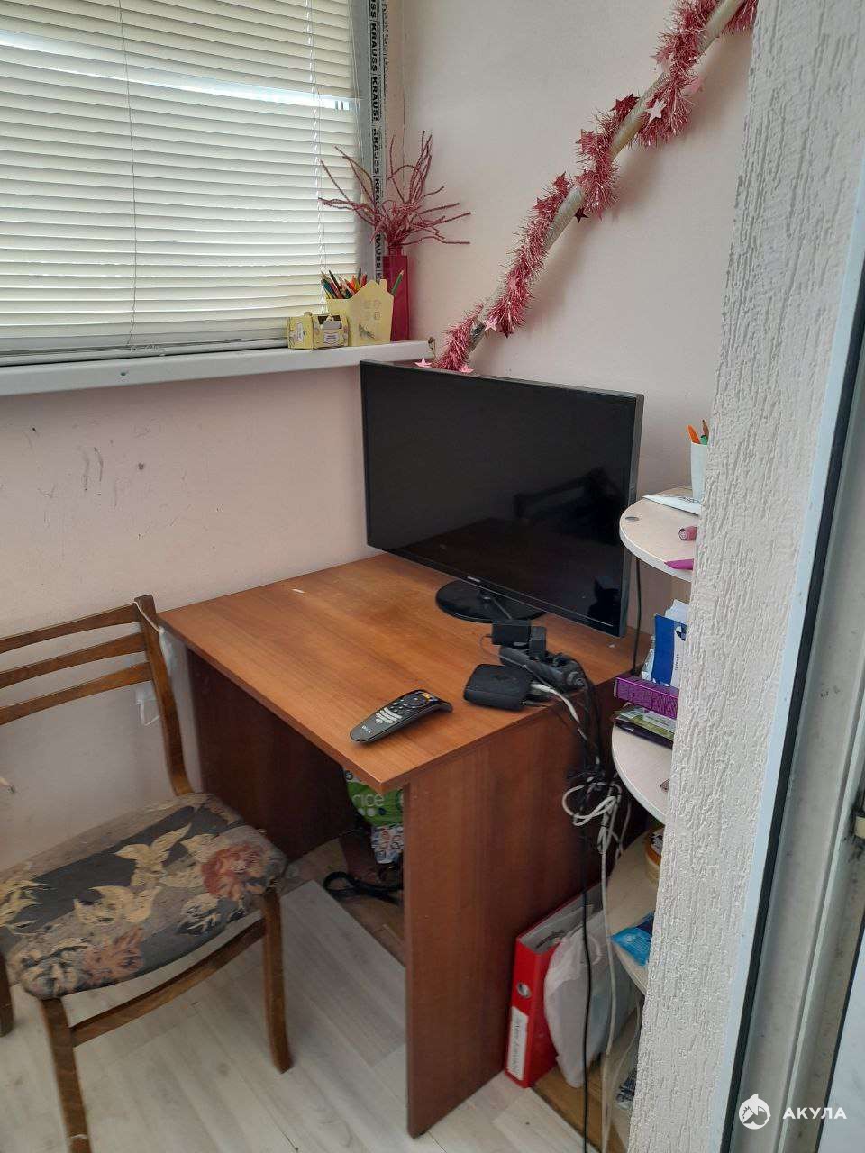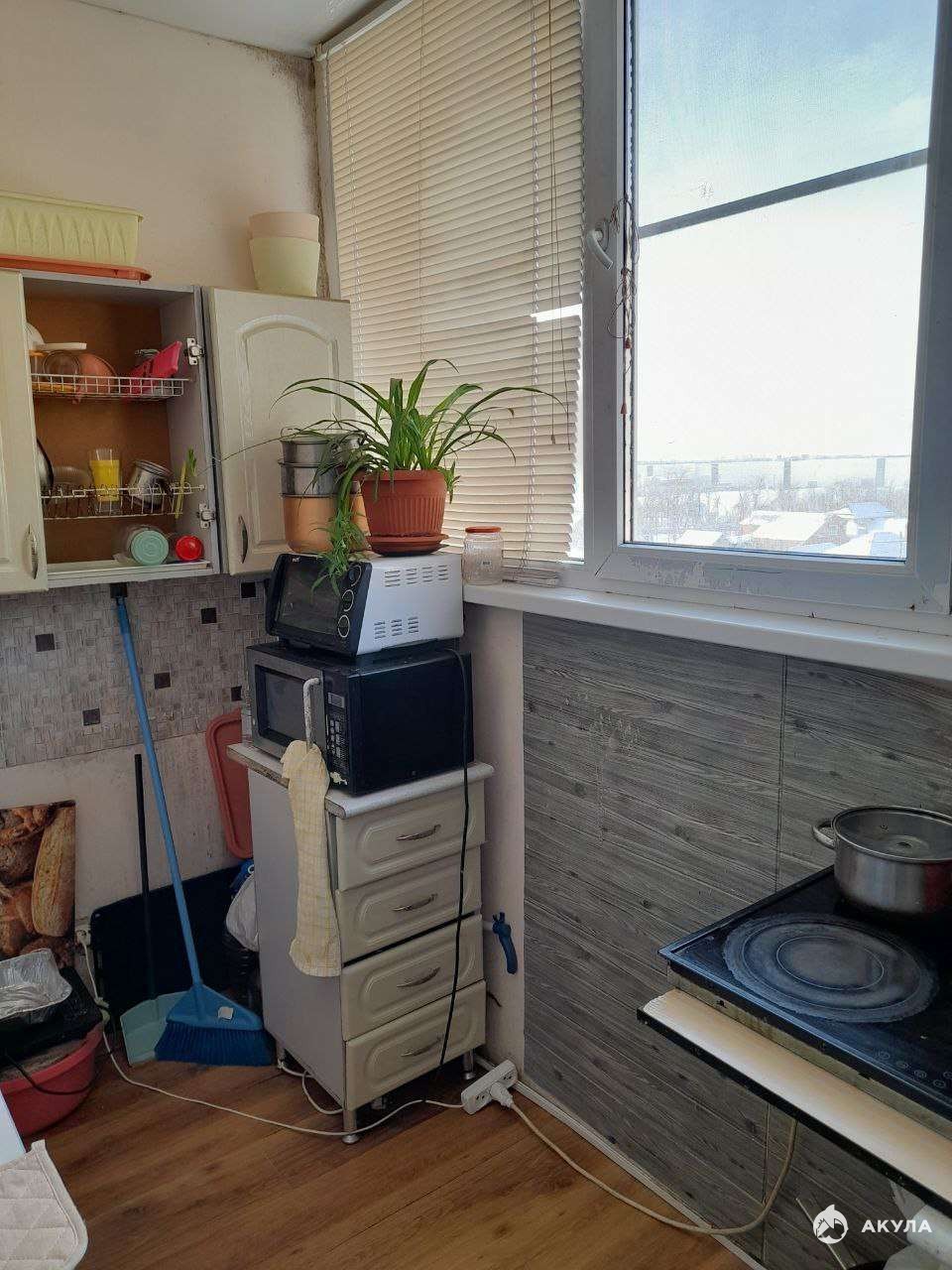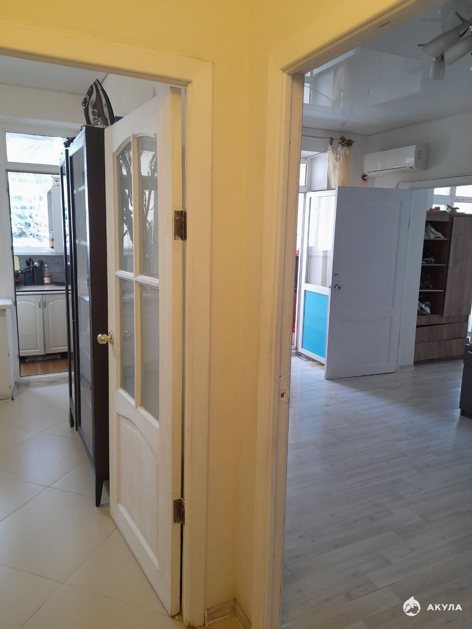 В квартире натяжные потолки, ламинат, стены окрашены, нуждаются в обновлении, но жить можно.