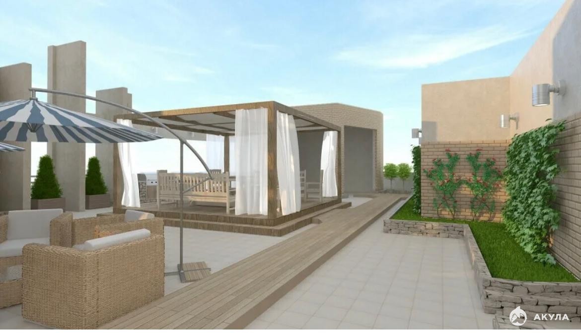 Имеется небольшой закрытый внутренний двор не виден с проезжей части с ландшафтным дизайном, детской площадкой, спортивными тренажерами, скамейками, шатром для отдыха и барбекю, открытым в тёплое время года.