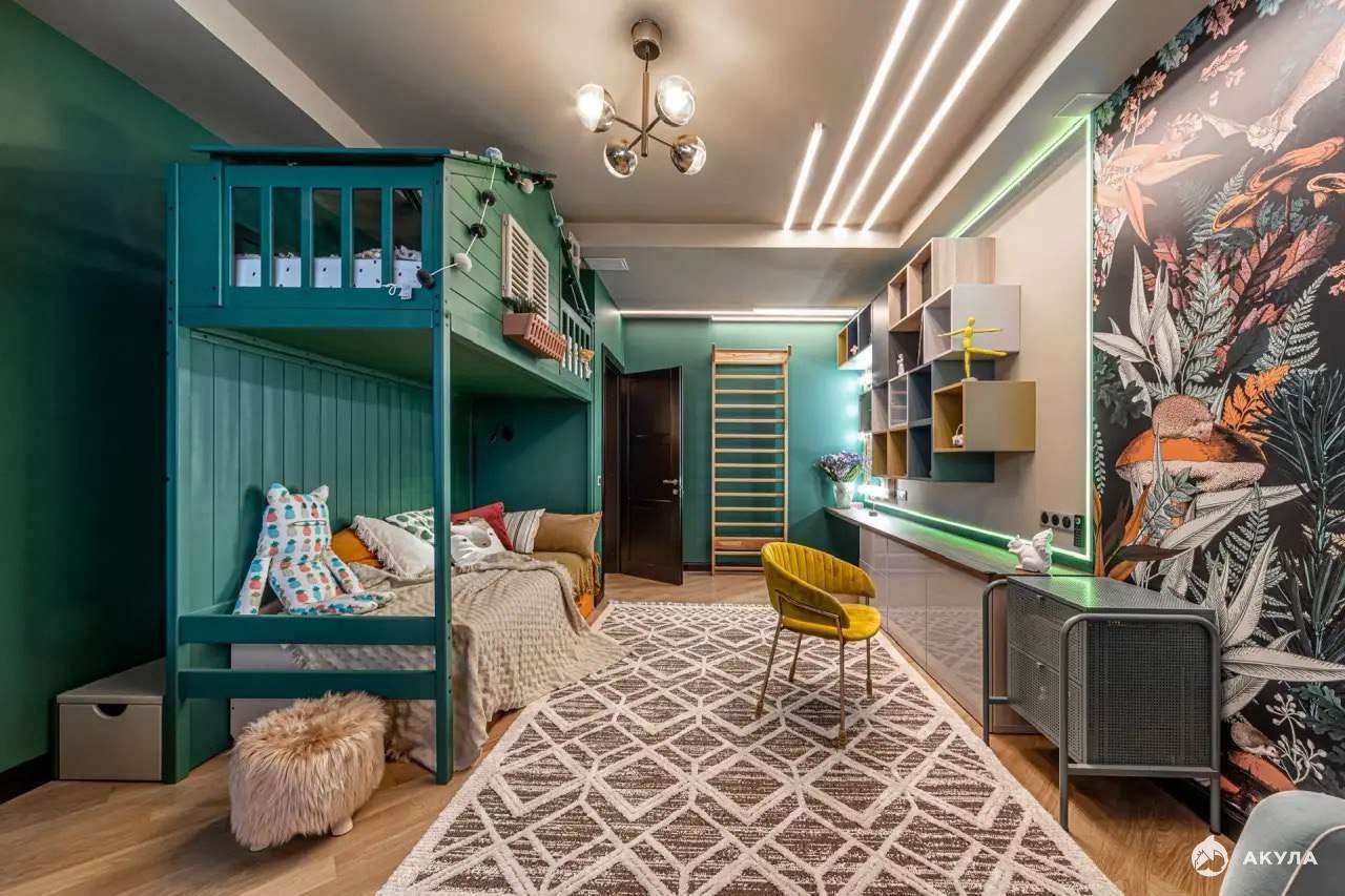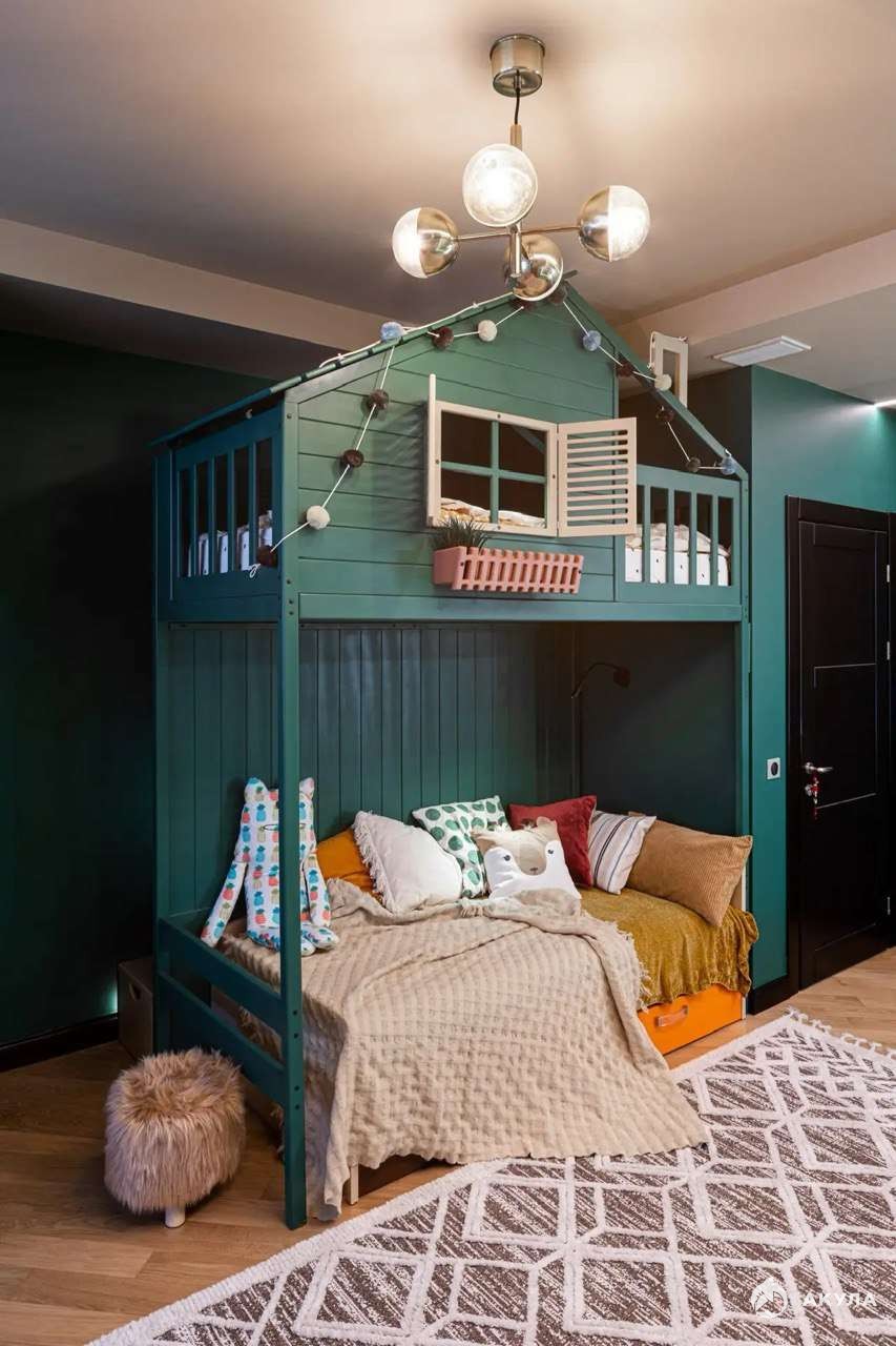 Оснащена домашним кинотеатром: проектор, акустическая система, лаунж-зона.