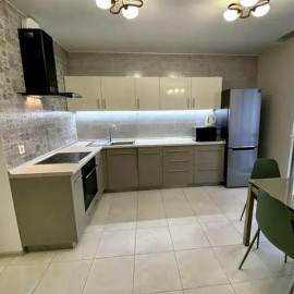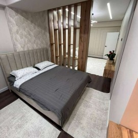 Сдается квартира с хорошим ремонтом. Есть отдельная спальня, мебелированная двухместной кроватью, рабочим столиком, шкафом-стенкой с раздвижными дверьми. Над кроватью длинная полка, можно приспособить для растений, фотографий, книг или иных декораций. Кухня из деревянных...