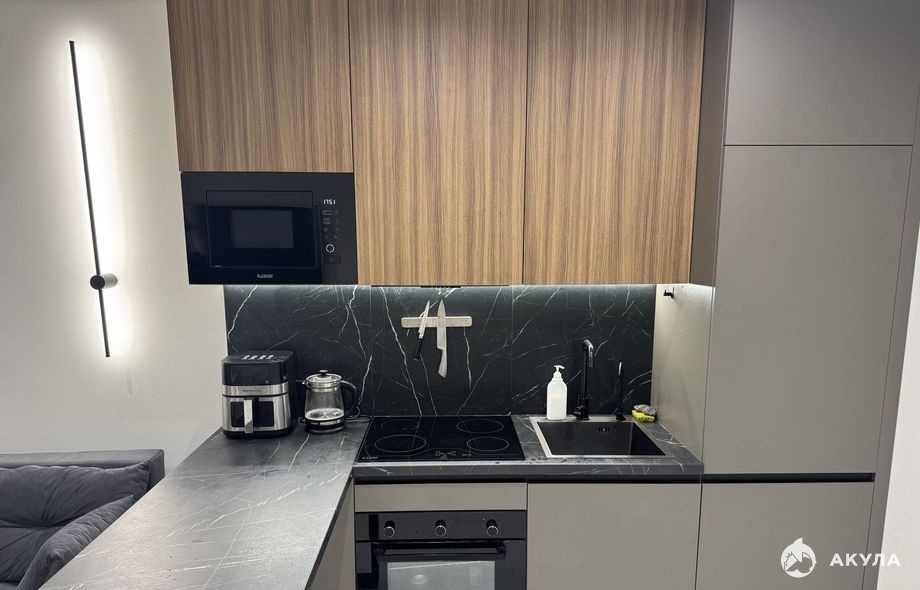 Для хранения предусмотрены шкафы, комоды и тумбы. Спальня обеспечивает комфортный отдых, кухня оснащена микроволновкой, электрочайником и мультиваркой.