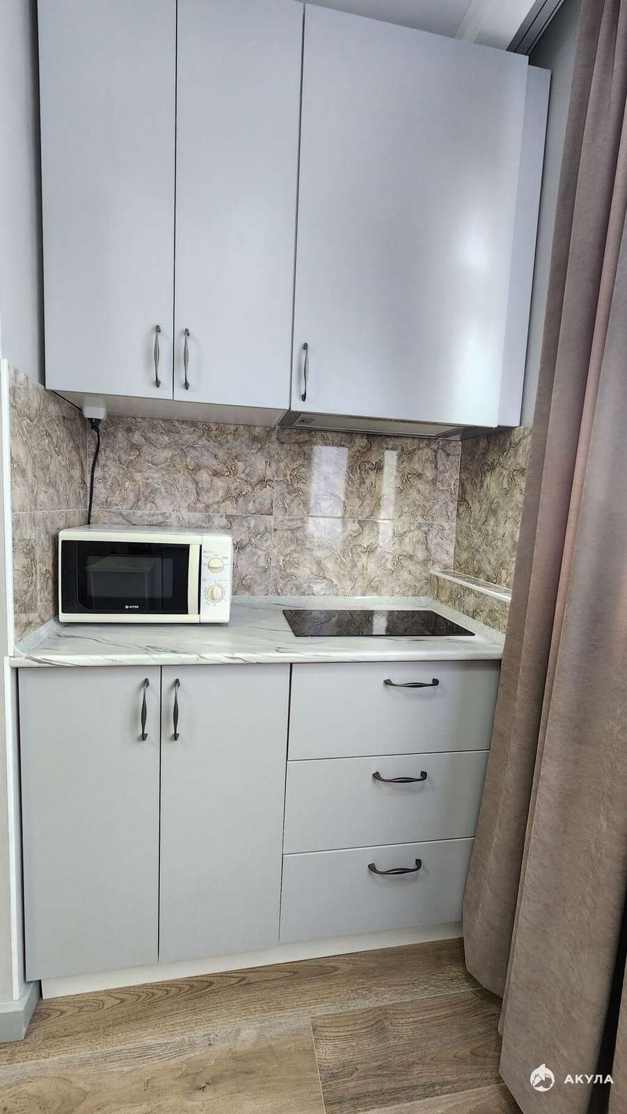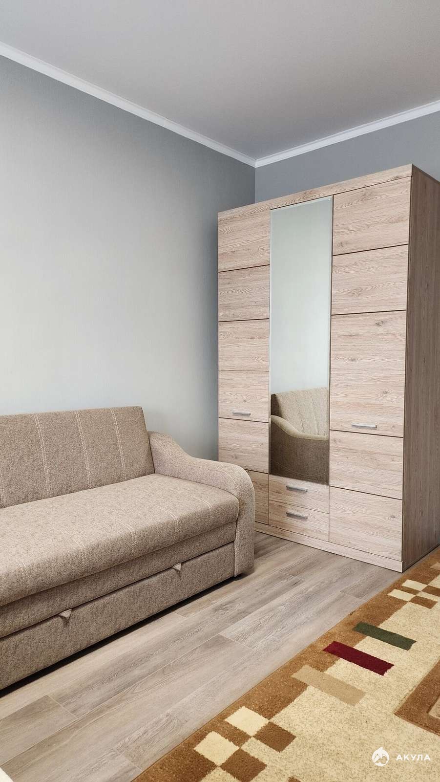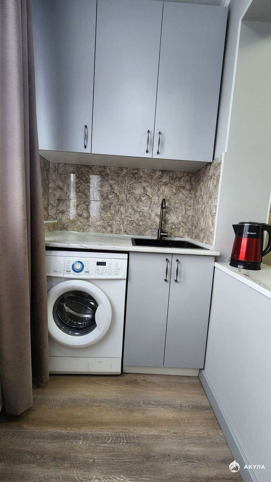 Имеется все необходимое: кухня с полным набором техники — холодильник, электрическая плита и стиральная машина. В спальне — вместительный шкаф и раскладной диван в светлых тонах.