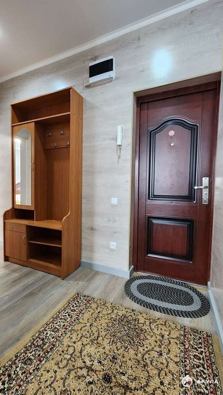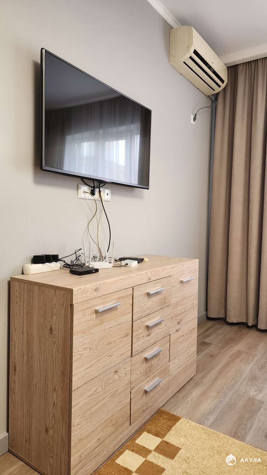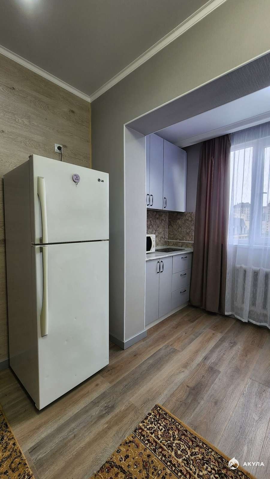 Имеется все необходимое: кухня с полным набором техники — холодильник, электрическая плита и стиральная машина. В спальне — вместительный шкаф и раскладной диван в светлых тонах.