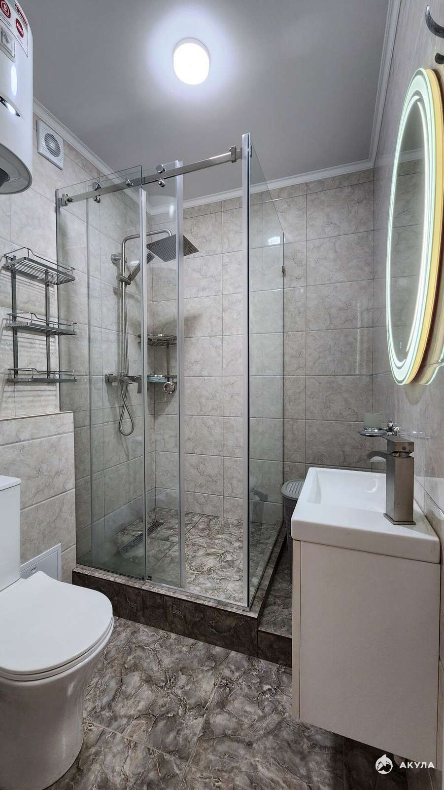 В санузле просторная душевая кабина, обеспечивающая комфорт при ванных процедурах, а так же зеркало с подсветкой по контуру, делающей утро немного светлее.