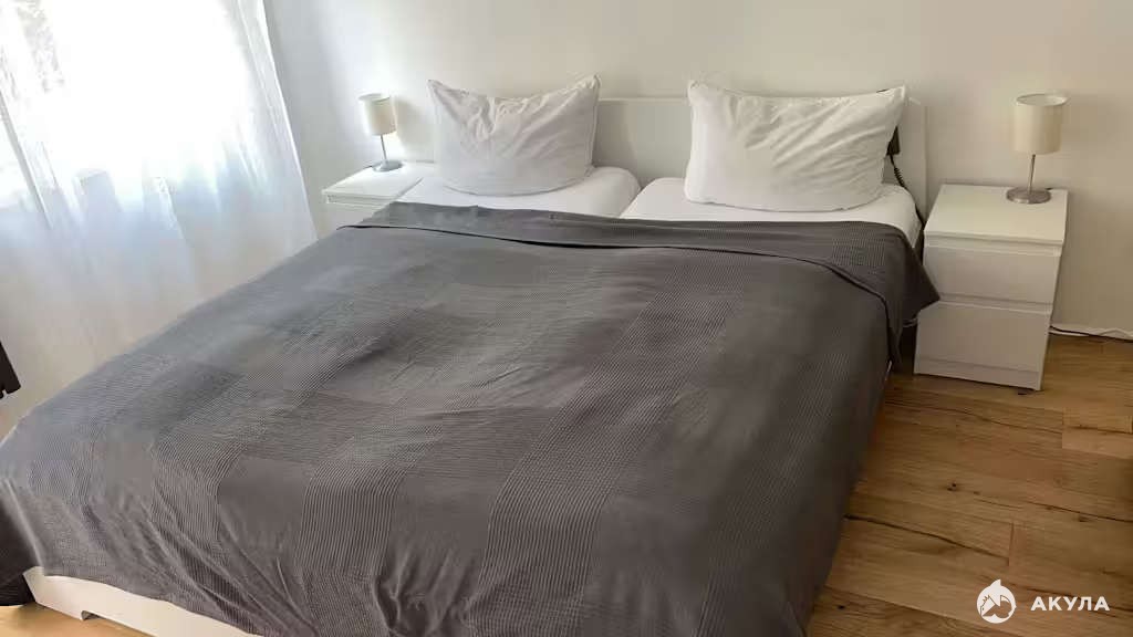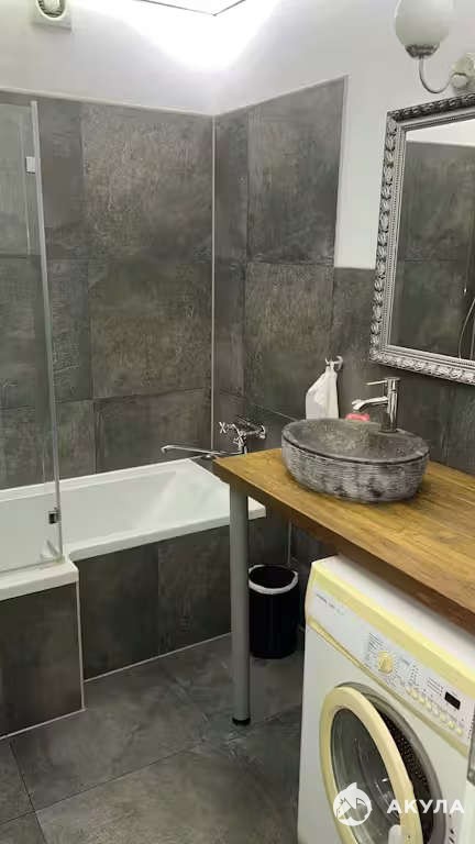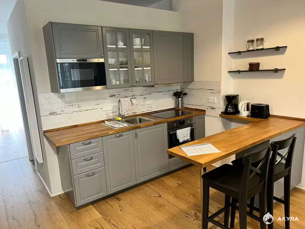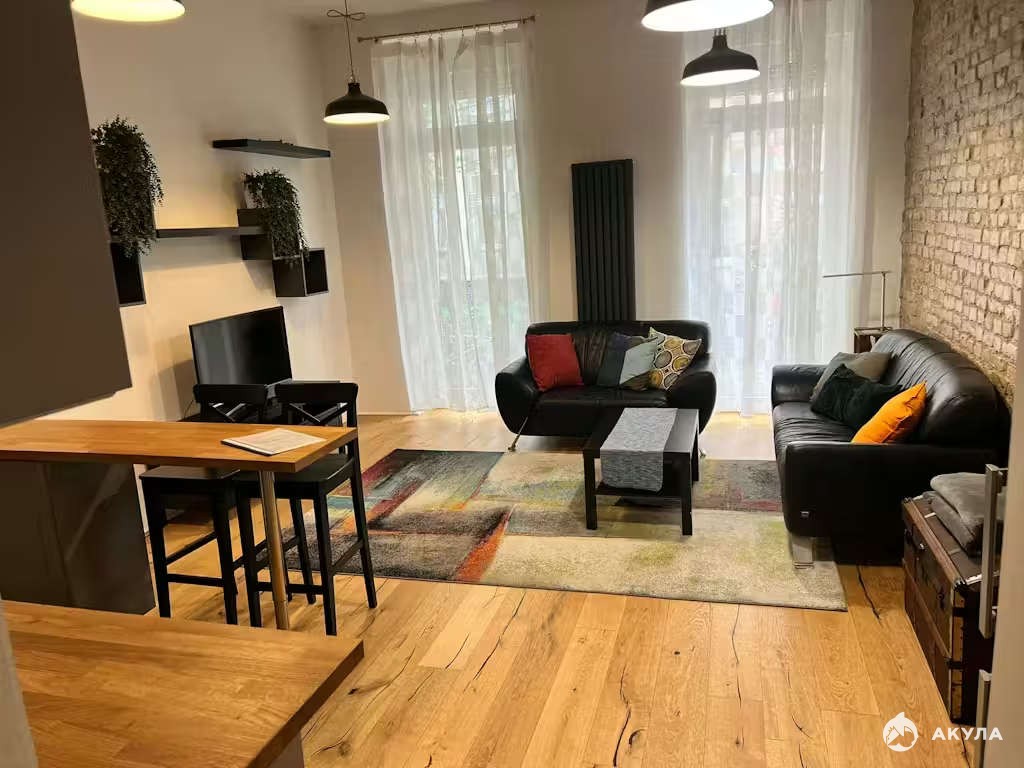 Сдается теплая и приятная квартира в свежем современном дизайне, размещённая в спокойном уголке города. Оформление интерьера выполнено преимущественно в светлой палитре, благодаря чему создается впечатление просторности и воздушности пространства. Серые шкафчики с прозрачными стеклами гармонично сочетаются с интегрированными бытовыми приборами (такими как духовая печь и СВЧ). Рабочая поверхность выполнена из благородного светлого дерева. Потолок украшен элегантным подвесным светильником с аккуратными округлыми абажурами. Пол покрыт натуральным деревянным покрытием светло-пастельных оттенков. Центральным элементом гостиной служит стильный черный диван с приятной текстурной отделкой и красивыми подушечками. Напротив дивана расположен прозрачный журнальный столик на изящных металлических опорах. Дополнительный уют придает светлое кресло с фактурной тканью. Изюминкой обстановки становится большое зеркальное полотно в лаконичной чёрной оправе, расположенное напротив стены с яркой абстрактной картиной. Вся атмосфера квартиры подчеркивает гармонию стиля и комфорта, здесь царят светлые тона и элементы современного минимализма, создающие атмосферу чистоты и свободы от визуального шума. Такое жильё прекрасно подойдёт людям, стремящимся окружить себя уютом и современным интерьером.