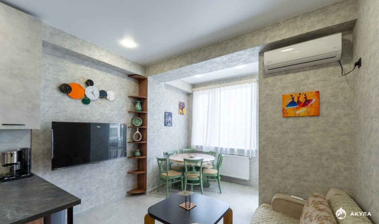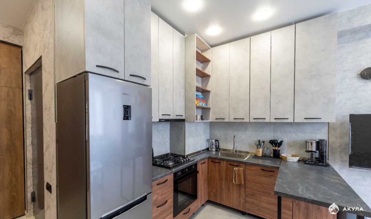 Кухня оснащена всей необходимой бытовой техникой: газовая плита с духовкой, холодильник, микроволновка и кофеварка. Функциональная барная стойка отделяет кухонную зону от гостиной и служит местом для приема гостей.
