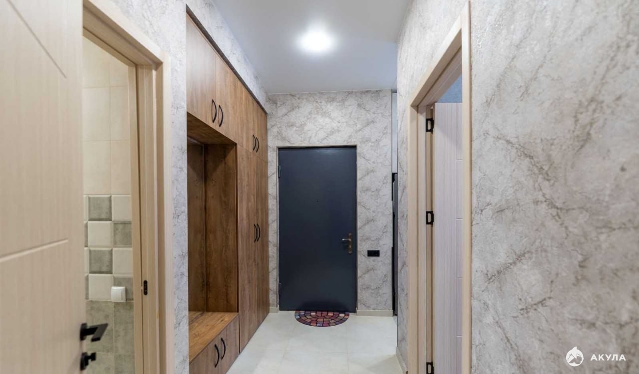 Прихожая включает практичную стенку с зеркалом для хранения верхней одежды и обуви.