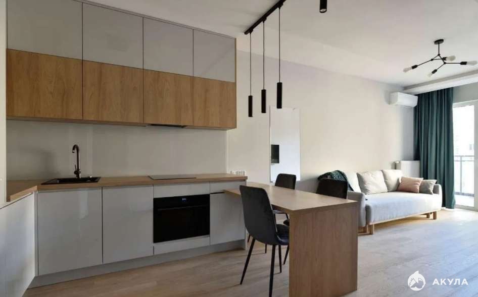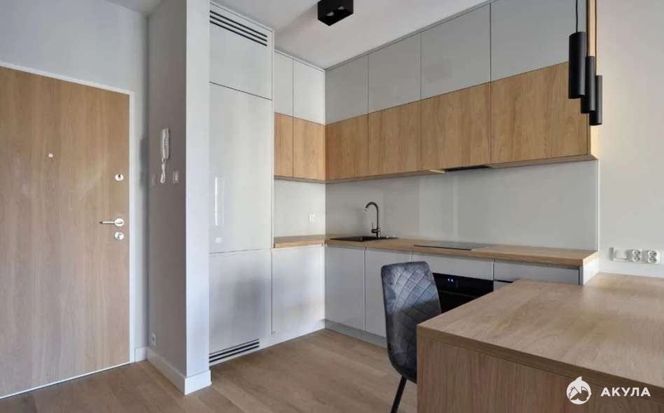 Кухня оборудована L-образным гарнитуром со светло-серыми глянцевыми фасадами. Верхний ряд шкафчиков выполнен с теплой древесной облицовкой, что добавляет уюта. Встроенная техника включает электрическую варочную панель, духовой шкаф и черную мойку с высоким смесителем. Светодиодная подсветка дает вспомогательное освещение для готовки.