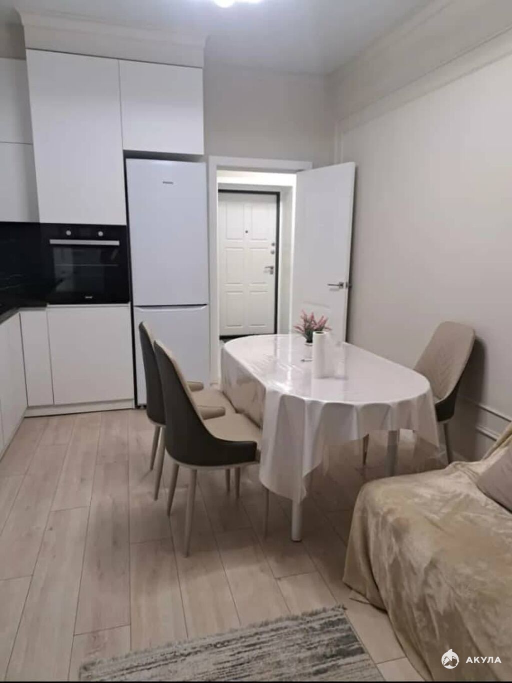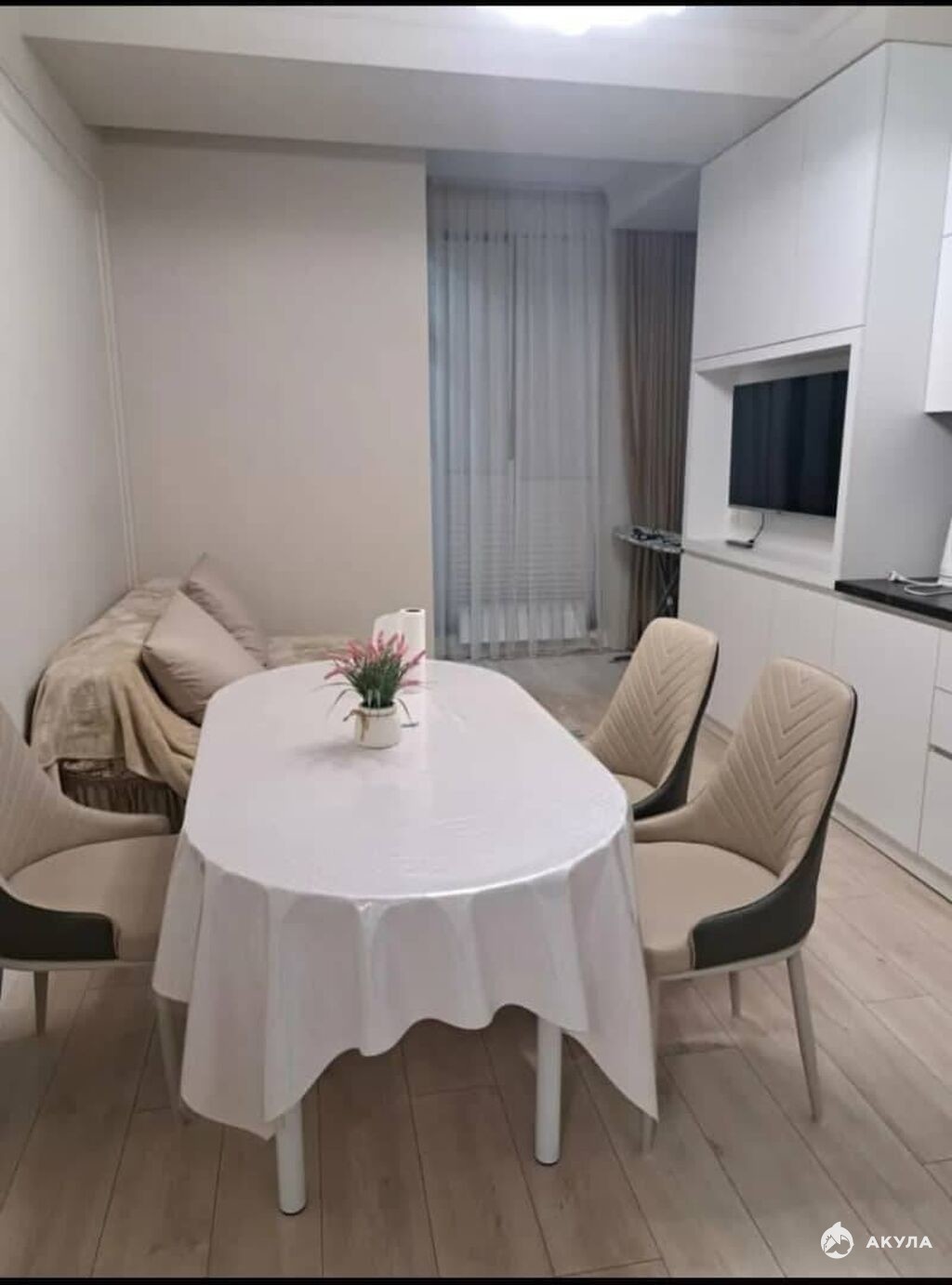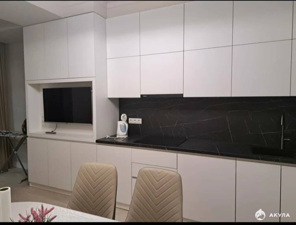 Кухня оформлена в белом цвете, оборудована всем необходимым: вместительный холодильник, микроволновая печь, гарнитур и обеденная зона, включающая стол и стулья, напротив которого установлен телевизор для комфортного просмотра фильмов и телевизионных программ.