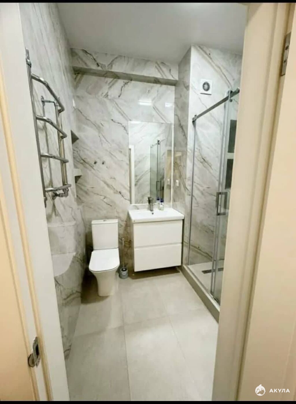 В санузле просторная душевая кабина, мощная стиральная машинка и умывальник.