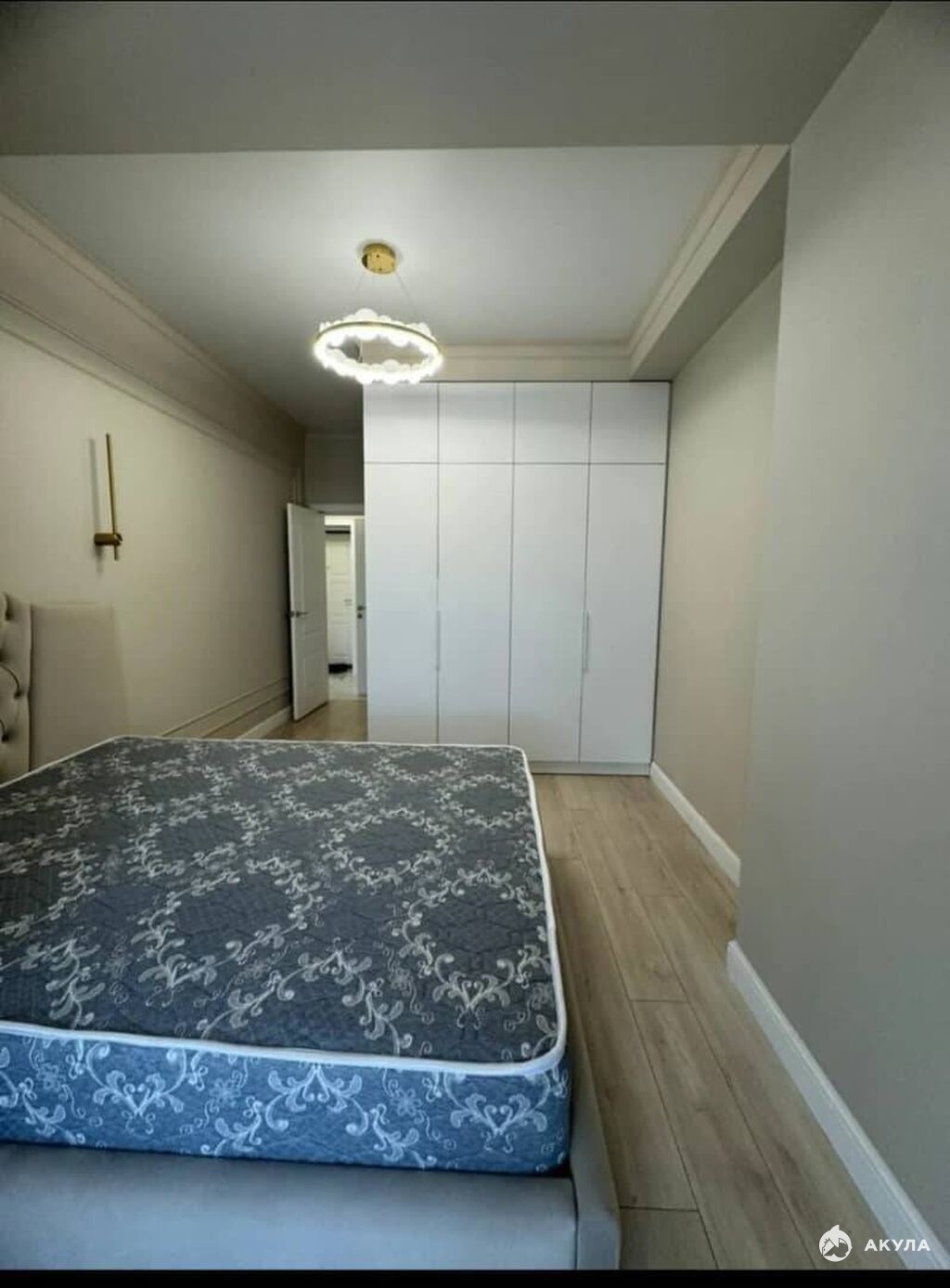 В спальне расположена двуспальная кровать. Для крупных предметов предусмотрен вместительный шкаф, а для маленьких у кровати стоит тумбочка.