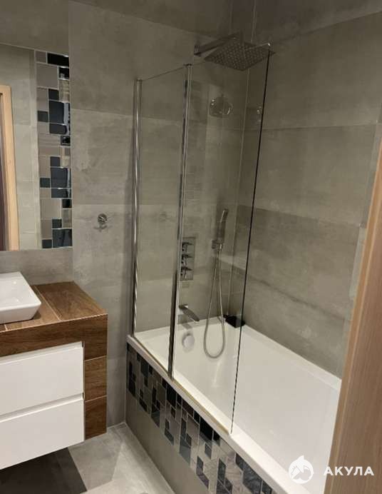 Санузел совмещённый, оборудован душевой кабиной, умывальником, подвесным унитазом и стиральной машиной. Зеркало с подсветкой и сочетание контрастной плитки.