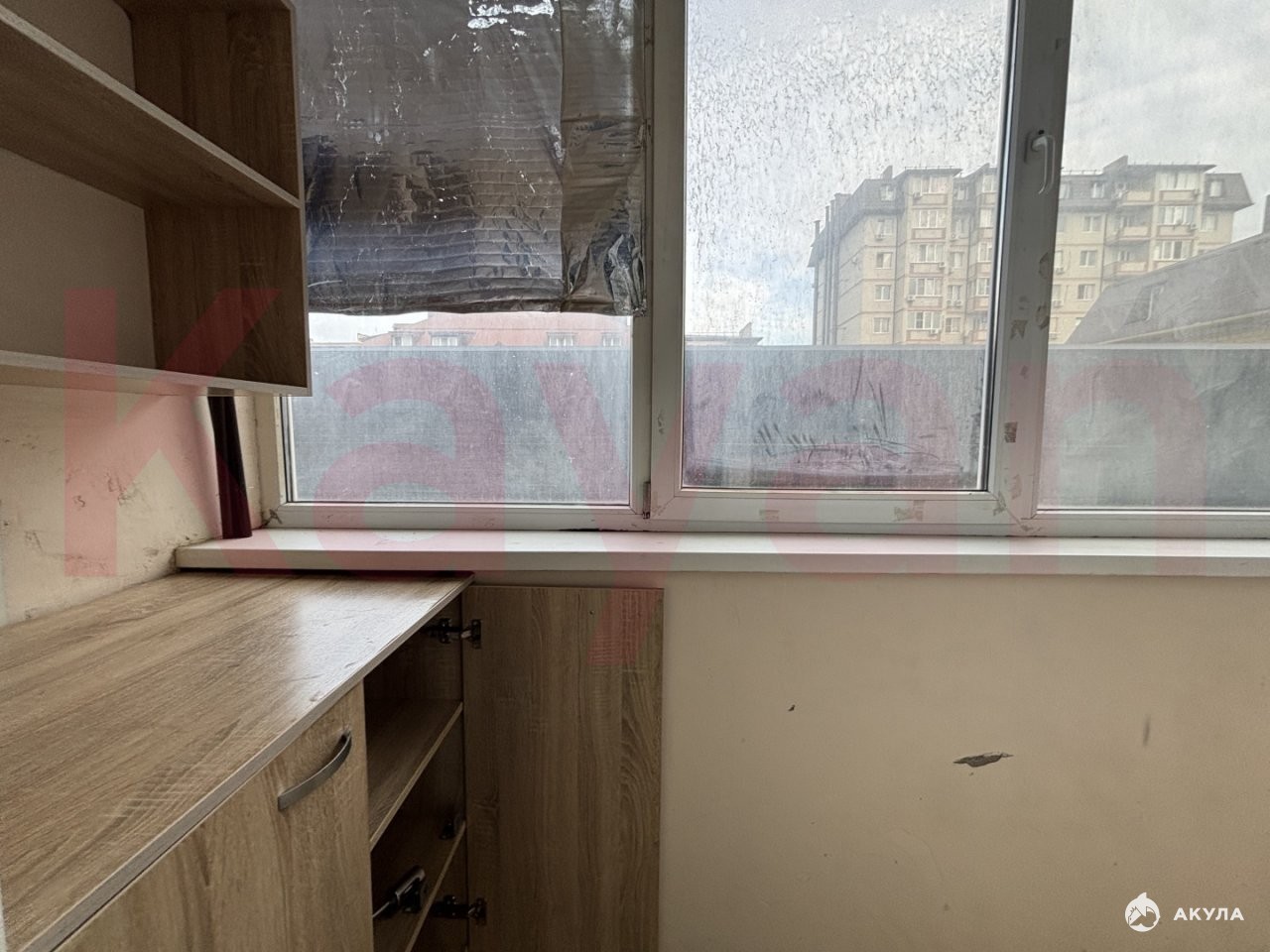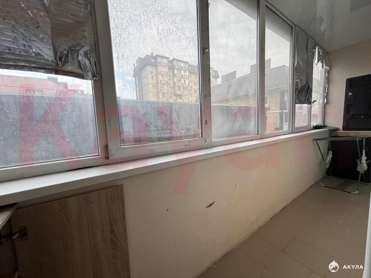Просторная светлая кухня, длинная застекленная лоджия. Санузел совмещенный — кафель на стенах и на полу.