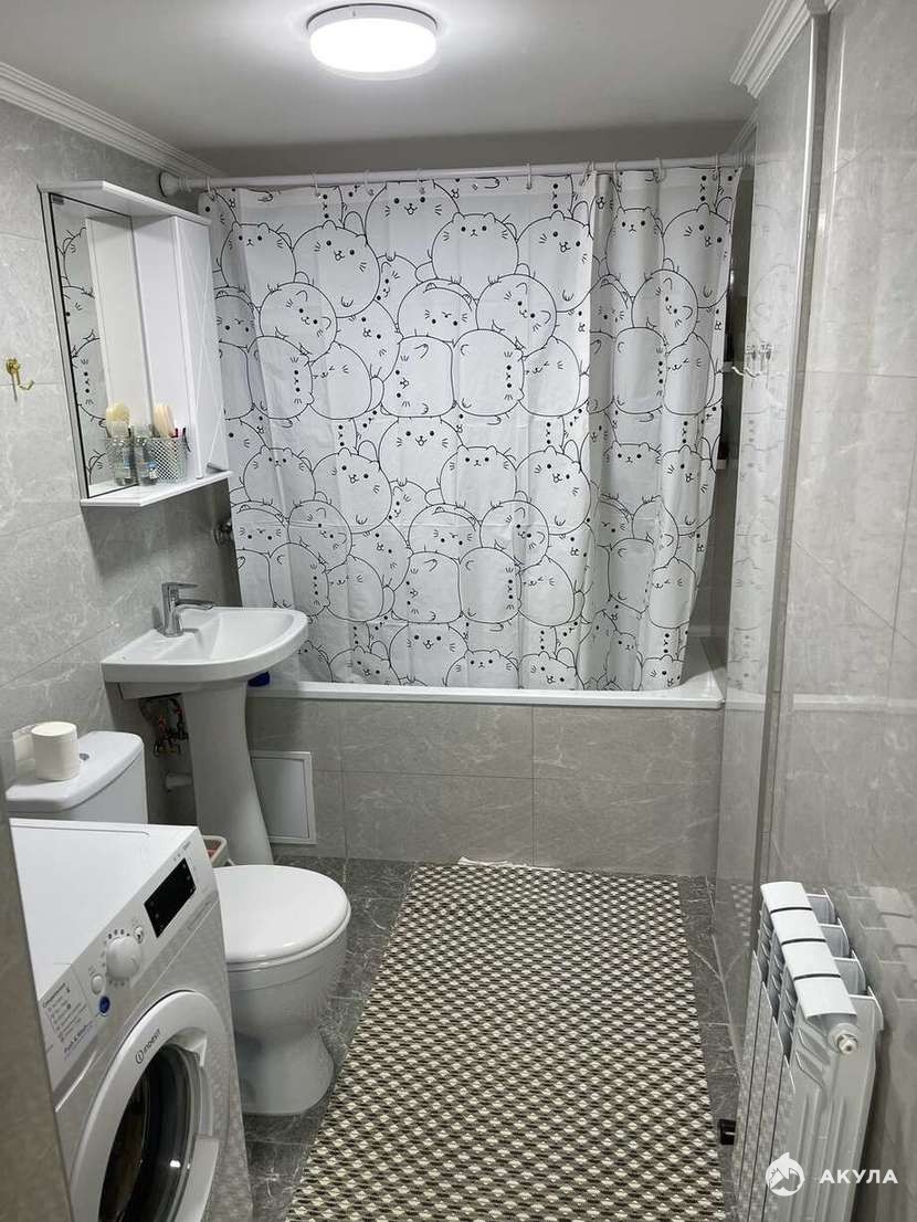 В санузле установлена полномасштабная ванна, стиральная машинка и умывальник. Все что нужно для бодрого начала дня, или приятного расслабления вечером.
