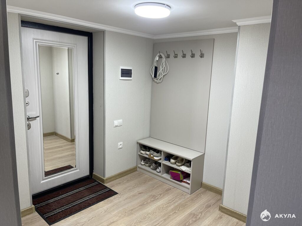 На первом располагается кухня, с полноценным гарнитуром, плитой, вместительным холодильником и микроволновкой. Совмещается с гостевой зоной, включающей телевизор и комфортный диван. При входе стоит вешалка для одежды и обувница.