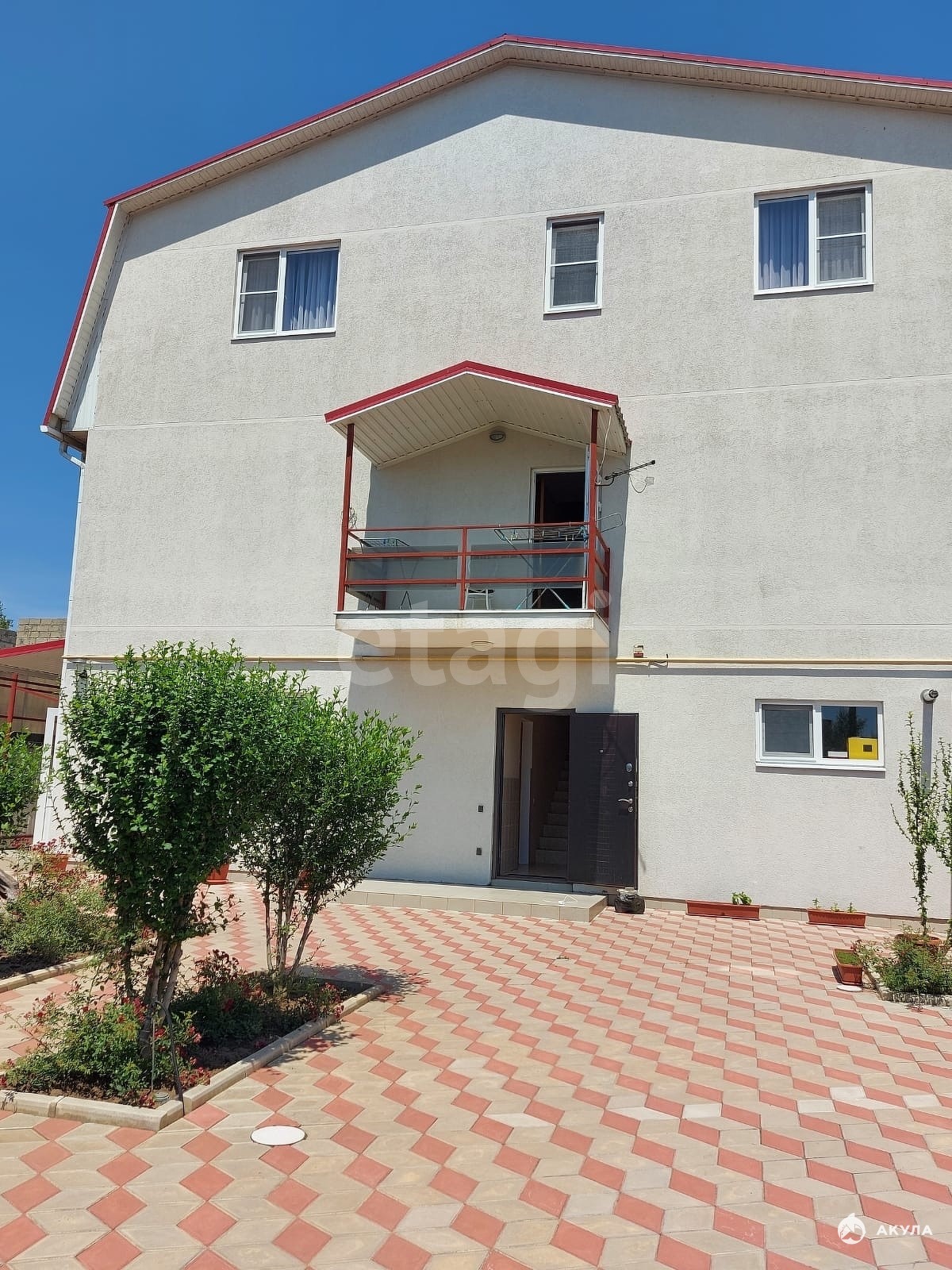 Двор уложен плиткой декорирован красивыми клумбами с розами и кустарниками.