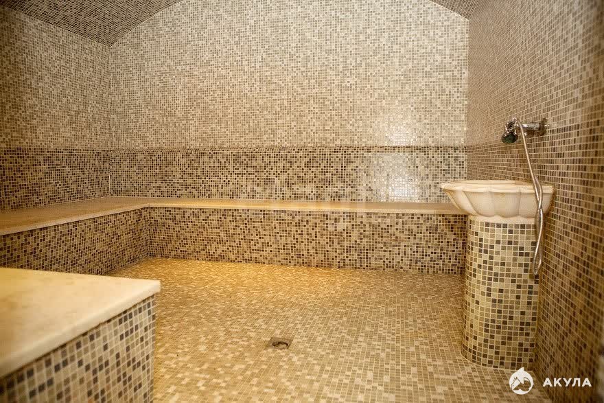 На первом этаже расположены ресепшн, БАССЕЙН С ПОДОГРЕВОМ, БАНЯ, ХАМАМ, душевые, хозяйственные помещения и четыре номера, включая вариант с кухонно-столовой зоной и просторной террасой.