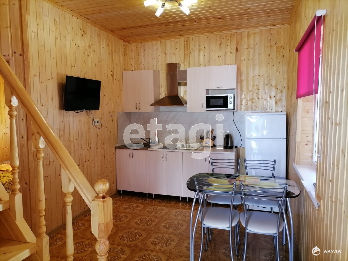 Кровля мягкая "Шинглас ранчо". Наполнитель-техноакустик, утеплитель, звукоизоляция, теплоизоляция. Внутри дома обшивка-вагонка (вскрыта маслом), на полу итальянский ламинат, инженерные сеты закрыты.