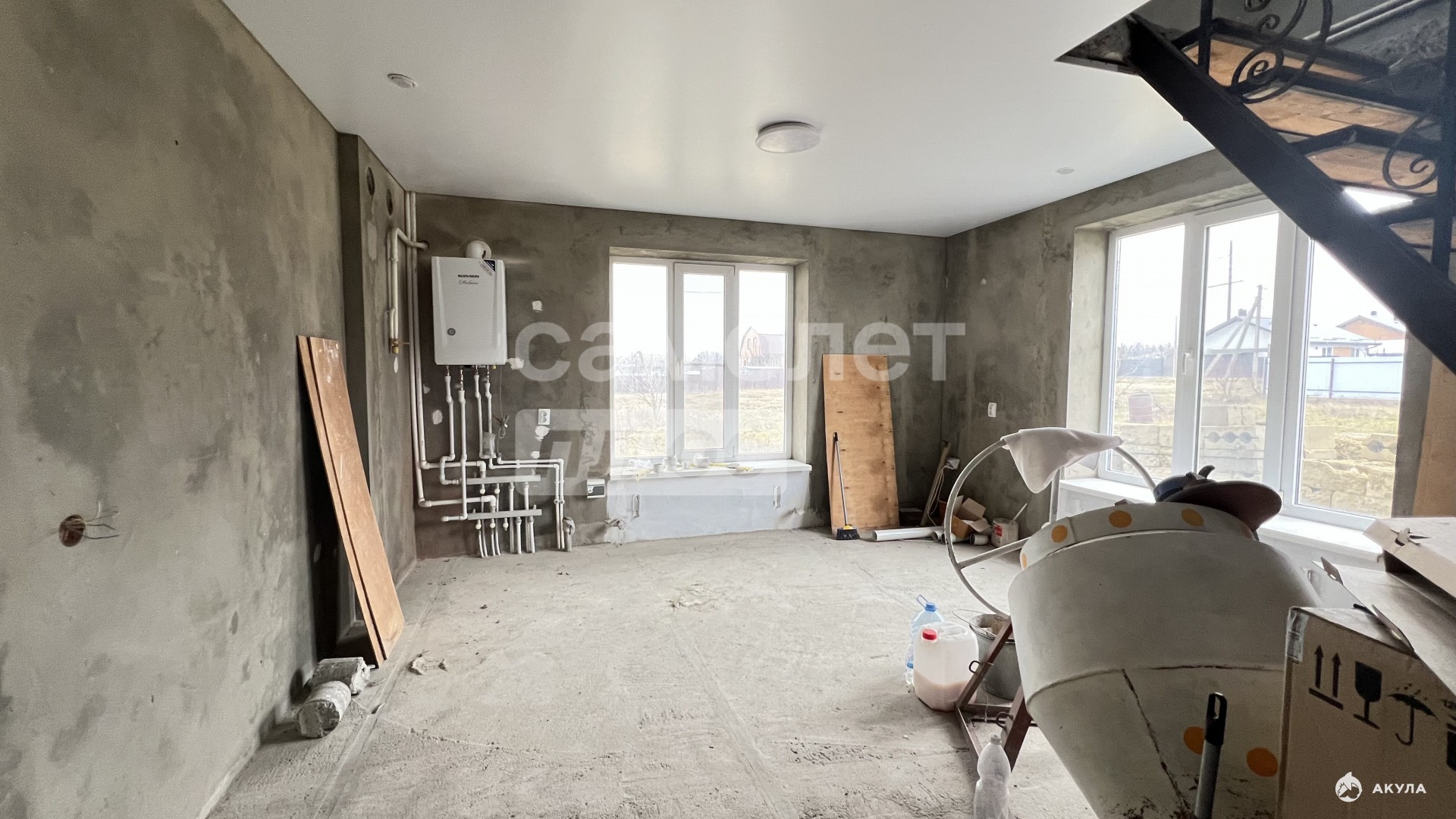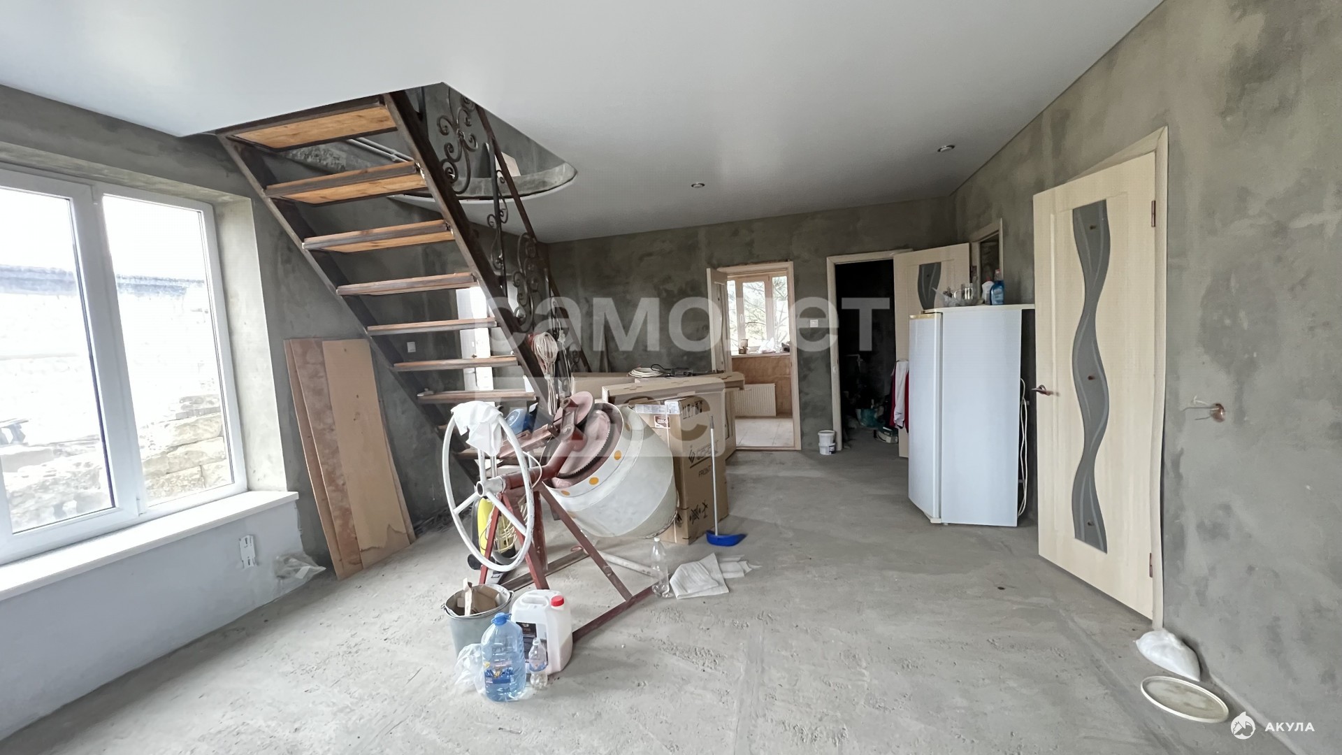 В доме 2 этажа, которые объединены лестницей из металлического каркаса: